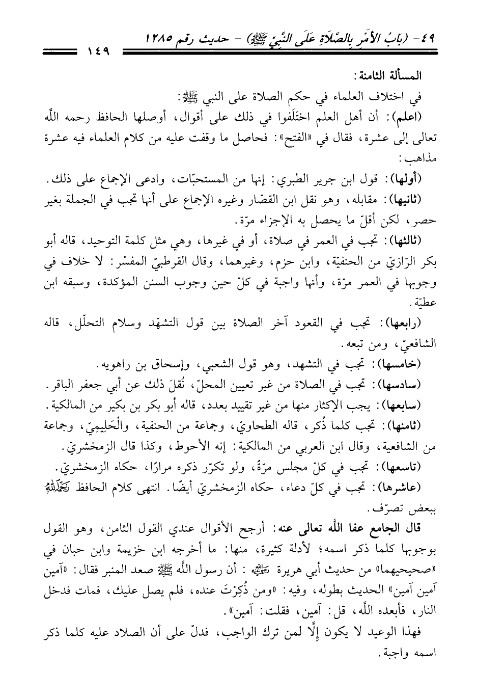 قال الجامع عفا الله تعالى عنه: أرجح الأقوال عندي القول الثامن، وهو القول بوجوبها كلما ذكر اسمه؛ لأدلة كثيرة؛ منها: ما أخرجه ابن خزيمة وابن حبان في "صحيحيهما" من حديث أبي هريرة -رضي الله عنه-: أن رسول الله -صلى الله عليه وسلم- صعد المنبر فقال: "آمين آمين آمين" الحديث بطوله، وفيه: "ومن ذُكِرْتَ عنده، فلم يصل عليك، فمات فدخل النار، فأبعده الله، قل: آمين، فقلت: آمين".