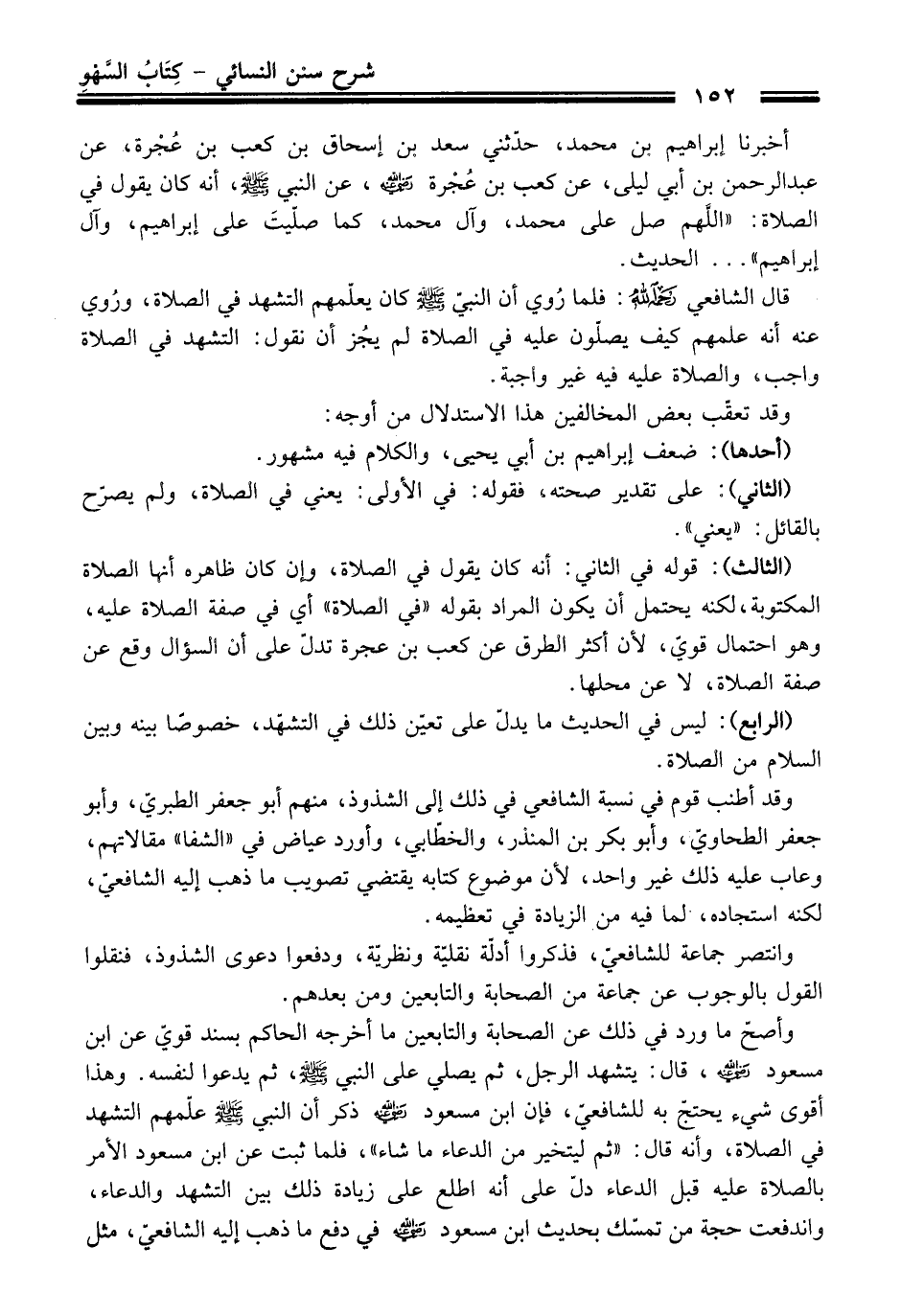 أخبرنا إبراهيم بن محمد، حدّثني سعد بن إسحاق بن كعب بن عُجْرة، عن عبد الرحمن بن أبي ليلى، عن كعب بن عُجْرة -صلى الله عليه وسلم-، عن النبي -صلى الله عليه وسلم-، أنه كان يقول في الصلاة: "اللَّهم صل على محمد، وآل محمد، كما صلّيتَ على إبراهيم، وآل إبراهيم" ... الحديث.