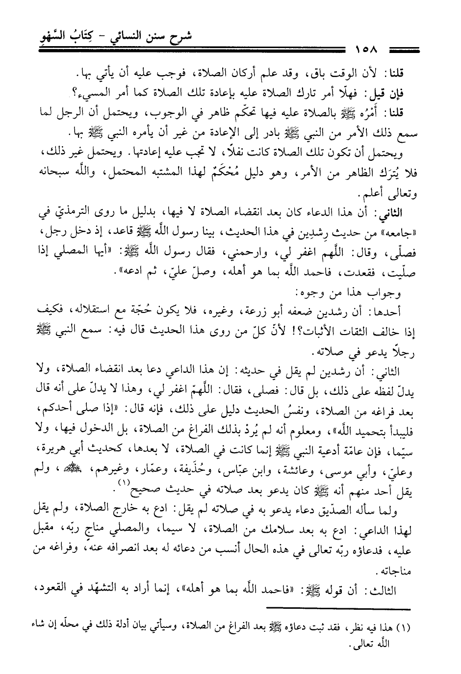 الثاني: أن رشدين لم يقل في حديثه: إن هذا الداعي دعا بعد انقضاء الصلاة، ولا يدلّ لفظه على ذلك، بل قال: فصلى، فقال: اللَّهمّ اغفر لي، وهذا لا يدلّ على أنه قال بعد فراغه من الصلاة، ونفسُ الحديث دليل على ذلك، فإنه قال: "إذا صلى أحدكم، فليبدأ بتحميد الله"، ومعلوم أنه لم يُردْ بذلك الفراغ من الصلاة، بل الدخول فيها، ولاسيّما، فإن عامّة أدعية النبي -صلى الله عليه وسلم- إنما كانت في الصلاة، لا بعدها، كحديث أبي هريرة، وعليّ، وأبي موسى، وعائشة، وابن عبّاس، وحُذَيفة، وعمّار، وغيرهم، -رضي الله عنهما-، ولم يقل أحد منهم أنه -صلى الله عليه وسلم- كان يدعو بعد صلاته في حديث صحيح (¬1).