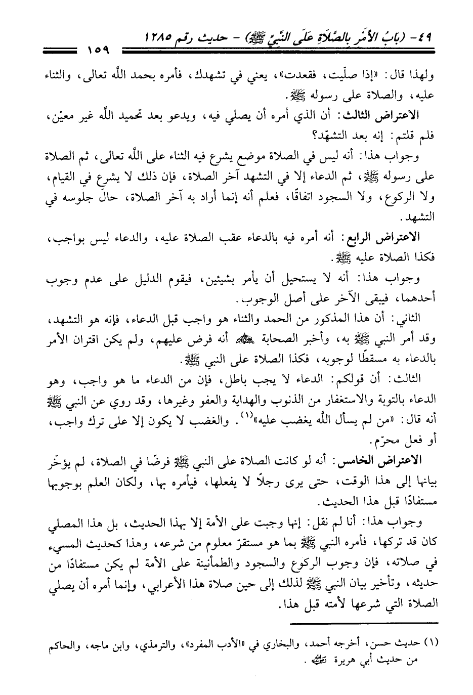 الاعتراض الخامس: أنه لو كانت الصلاة على النبي -صلى الله عليه وسلم- فرضاً في الصلاة، لم يؤخّر بيانها إلى هذا الوقت، حتى يرى رجلاً لا يفعلها، فيأمره بها، ولكان العلم بوجوبها مستفاداً قبل هذا الحديث.