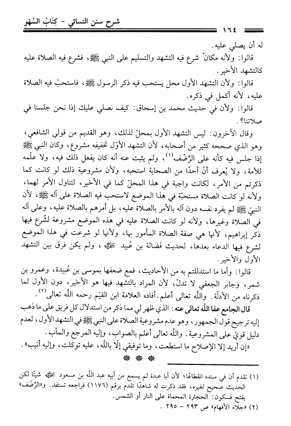 قالوا: وأما ما استدللتم به من الأحاديث، فمع ضعفها بموسى بن عُبيدة، وعمرو بن شمر، وجابر الجعفي لا تدلّ، لأن المراد بالتشهد فيها هو الأخير، دون الأول لما ذكرناه من الأدلّة. والله تعالى أعلم. أفاده العلامة ابن القيّم رحمه الله تعالى (¬2).