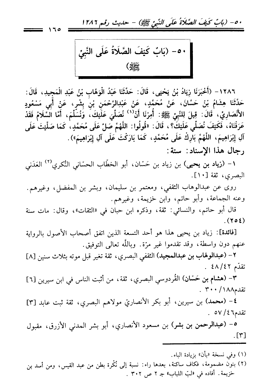 1286 - (أَخْبَرَنَا زِيَادُ بْنُ يَحْيَى، قَالَ: حَدَّثَنَا عَبْدُ الْوَهَّابِ بْنُ عَبْدِ الْمَجِيدِ، قَالَ: حَدَّثَنَا هِشَامُ بْنُ حَسَّانَ، عَنْ مُحَمَّدٍ، عَنْ عَبْدِ الرَّحْمَنِ بْنِ بِشْرٍ، عَنْ أَبِي مَسْعُودٍ الأَنْصَارِيِّ، قَالَ: قِيلَ لِلنَّبِىِّ -صلى الله عليه وسلم- أُمِرْنَا أَنْ (¬1) نُصَلِّيَ عَلَيْكَ، وَنُسَلِّمَ، أَمَّا السَّلاَمُ فَقَدْ عَرَفْنَاهُ، فَكَيْفَ نُصَلِّي عَلَيْكَ؟ قَالَ: "قُولُوا: اللَّهُمَّ صَلِّ عَلَى مُحَمَّدٍ، كَمَا صَلَّيْتَ عَلَى آلِ إِبْرَاهِيمَ، اللَّهُمَّ بَارِكْ عَلَى مُحَمَّدٍ، كَمَا بَارَكْتَ عَلَى آلِ إِبْرَاهِيمَ").