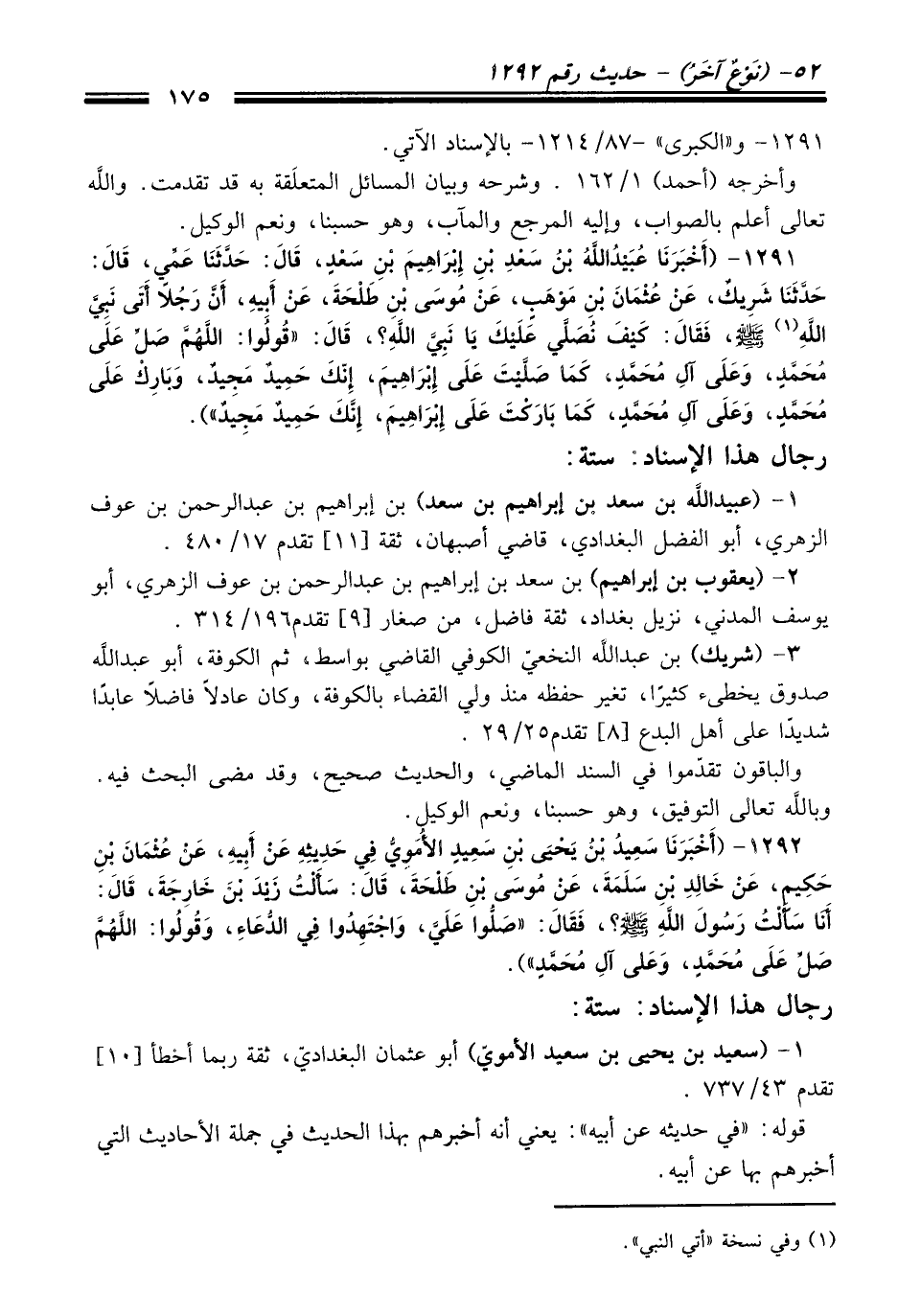 1291 - (أَخْبَرَنَا عُبَيْدُ اللَّهِ بْنُ سَعْدِ بْنِ إِبْرَاهِيمَ بْنِ سَعْدٍ، قَالَ: حَدَّثَنَا عَمِّي، قَالَ: حَدَّثَنَا شَرِيكٌ، عَنْ عُثْمَانَ بْنِ مَوْهَبٍ، عَنْ مُوسَى بْنِ طَلْحَةَ، عَنْ أَبِيهِ، أَنَّ رَجُلاً أَتَى نَبِيَّ اللَّهِ (¬1) -صلى الله عليه وسلم- فَقَالَ: كَيْفَ نُصَلِّي عَلَيْكَ يَا نَبِيَّ اللَّهِ؟ قَالَ: "قُولُوا: اللَّهُمَّ صَلِّ عَلَى مُحَمَّدٍ، وَعَلَى آلِ مُحَمَّدٍ، كَمَا صَلَّيْتَ عَلَى إِبْرَاهِيمَ، إِنَّكَ حَمِيدٌ مَجِيدٌ، وَبَارِكْ عَلَى مُحَمَّدٍ، وَعَلَى آلِ مُحَمَّدٍ، كَمَا بَارَكْتَ عَلَى إِبْرَاهِيمَ، إِنَّكَ حَمِيدٌ مَجِيدٌ").