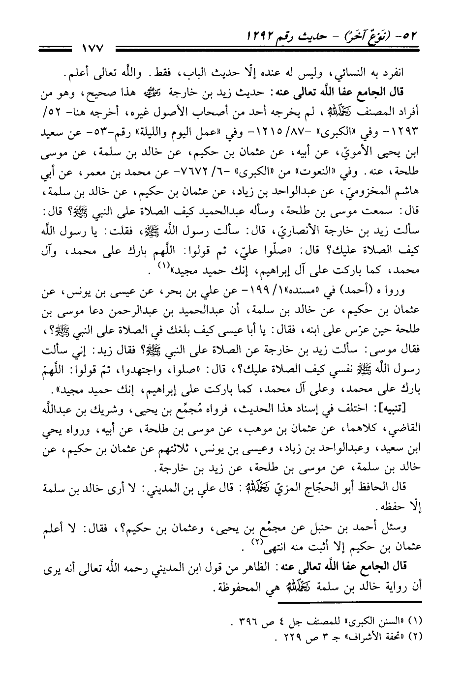 قال الجامع عفا الله تعالى عنه: حديث زيد بن خارجة -رضي الله عنه- هذا صحيح، وهو من أفراد المصنف رحمه الله، لم يخرجه أحد من أصحاب الأصول غيره، أخرجه هنا -52/ 1293 - وفي "الكبرى" -87/ 1215 - وفي "عمل اليوم والليلة" رقم -53 - عن سعيد ابن يحيى الأمويّ، عن أبيه، عن عثمان بن حكيم، عن خالد بن سلمة، عن موسى طلحة، عنه. وفي "النعوت" من "الكبرى" -6/ 7672 - عن محمد بن معمر، عن أبي هاشم المخزوميّ، عن عبد الواحد بن زياد، عن عثمان بن حكيم، عن خالد بن سلمة، قال: سمعت موسى بن طلحة، وسأله عبد الحميد كيف الصلاة على النبي -صلى الله عليه وسلم-؟ قال: سألت زيد بن خارجة الأنصاريّ، قال: سألت رسول الله -صلى الله عليه وسلم-, فقلت: يا رسول الله كيف الصلاة عليك؟ قال: "صلّوا عليّ، ثم قولوا: اللَّهم بارك على محمد، وآل محمد، كما باركت على آل إبراهيم، إنك حميد مجيد" (¬1).