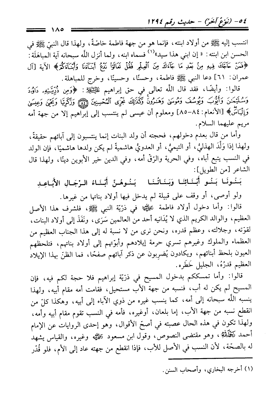 قالوا: وأما دخول أولاد فاطمة -رضي الله عنها- في ذرّيّة البني -صلى الله عليه وسلم-، فلشرف هذا الأصل العظيم، والوالد الكريم الذي لا يُدَانيه أحد من العالمين سَرَى، ونَفَذَ إلى أولاد البنات، لقوّته، وجلالته، وعظم قدره، ونحن نرى من لا نسبة له إلى هذا الجناب العظيم من العظماء والملوك وغيرهم تسري حرمة إيلادهم وأبوّتهم إلى أولاد بناتهم، فتلحظهم العيون بلحظ أبنائهم, ويكادون يُضرِبون عن ذكر آبائهم صفحاً، فما الظن بهذا الإيلاد العظيم قدرُهُ، الجليل خَطَره.
