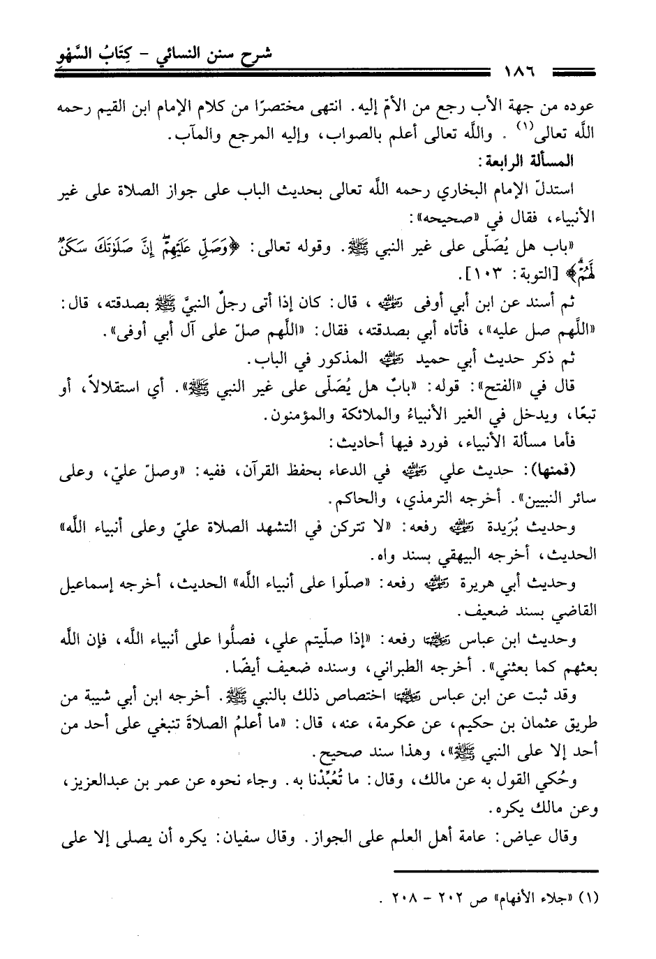 ثم أسند عن ابن أبي أوفى -رضي الله عنه-، قال: كان إذا أتى رجلٌ النبيَّ -صلى الله عليه وسلم- بصدقته, قال: "اللَّهم صل عليه"، فأتاه أبي بصدقته، فقال: "اللَّهم صلّ على آل أبي أوفى".