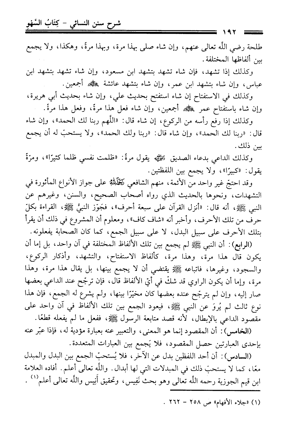 وقد احتجّ غير واحد من الأئمة، منهم الشافعي رحمه الله على جواز الأنواع المأثورة في التشهدات، ونحوها بالحديث الذي رواه أصحاب الصحيح، والسنن، وغيرهم عن النبي -صلى الله عليه وسلم-، أنه قال: "أنزل القرآن على سبعة أحرف"، فجَوّز النبي -صلى الله عليه وسلم-، القراءة بكلّ حرف من تلك الأحرف، وأخبر أنه "شاف كاف"، ومعلوم أن المشروع في ذلك أن يقرأ بتلك الأحرف على سبيل البدل، لا على سبيل الجمع، كما كان الصحابة يفعلونه.
