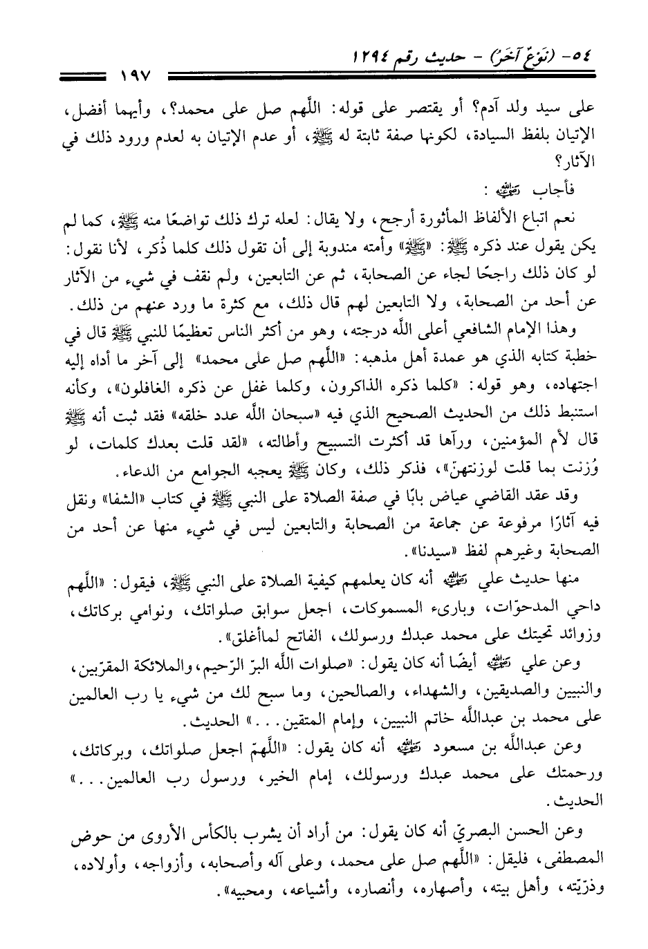 وقد عقد القاضي عياض باباً في صفة الصلاة على النبي -صلى الله عليه وسلم- في كتاب "الشفا" ونقل فيه آثاراً مرفوعة عن جماعة من الصحابة والتابعين ليس في شيء منها عن أحد من الصحابة وغيرهم لفظ "سيدنا".