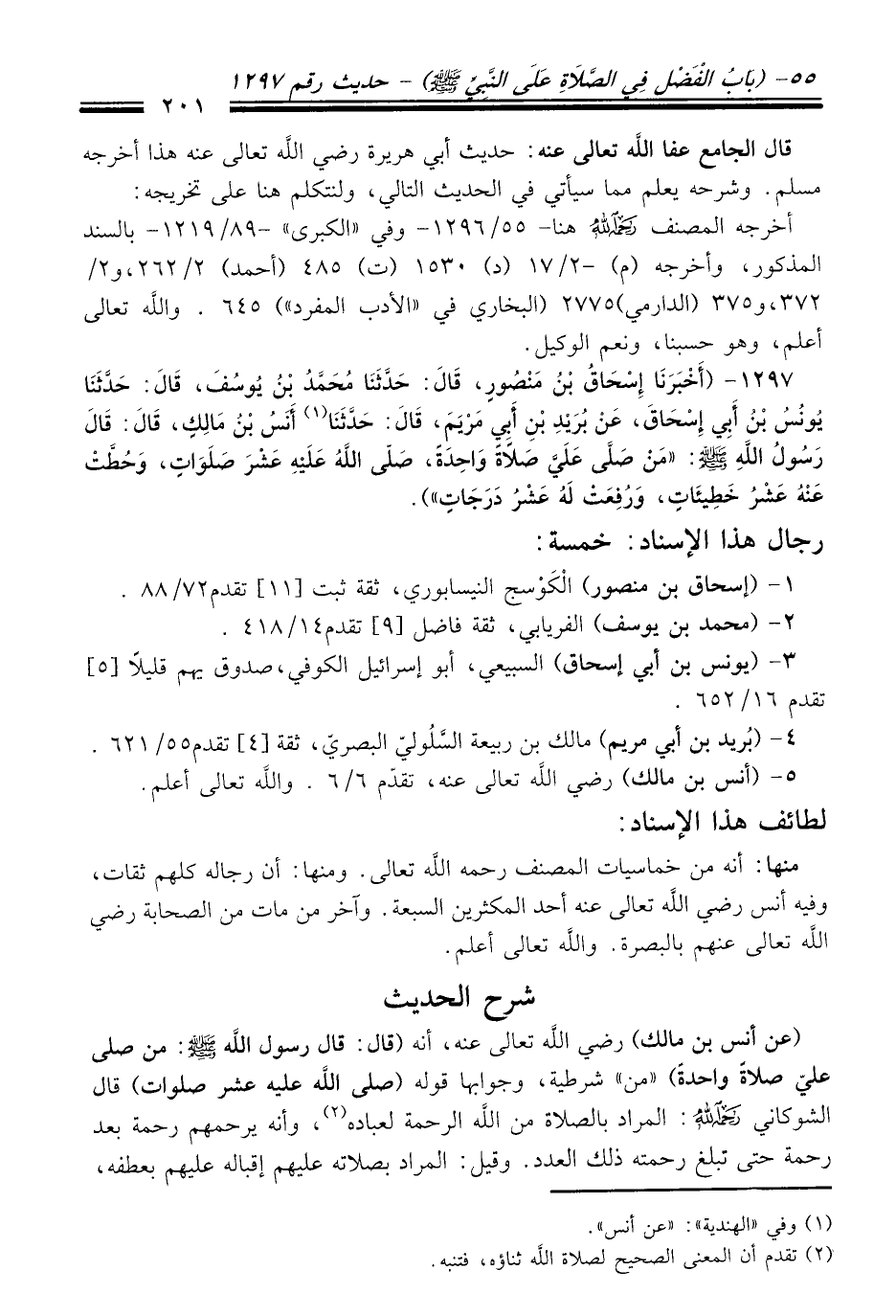 (عن أنس بن مالك) رضي الله تعالى عنه، أنه (قال: قال رسول الله -صلى الله عليه وسلم-: من صلى عليّ صلاةً واحدةً) "من" شرطية، وجوابها قوله (صلى الله عليه عشر صلوات) قال الشوكاني رحمه الله: المراد بالصلاة من الله الرحمة لعباده (¬2)، وأنه يرحمهم رحمة بعد رحمة حتى تبلغ رحمته ذلك العدد. وقيل: المراد بصلاته عليهم إقباله عليهم بعطفه،