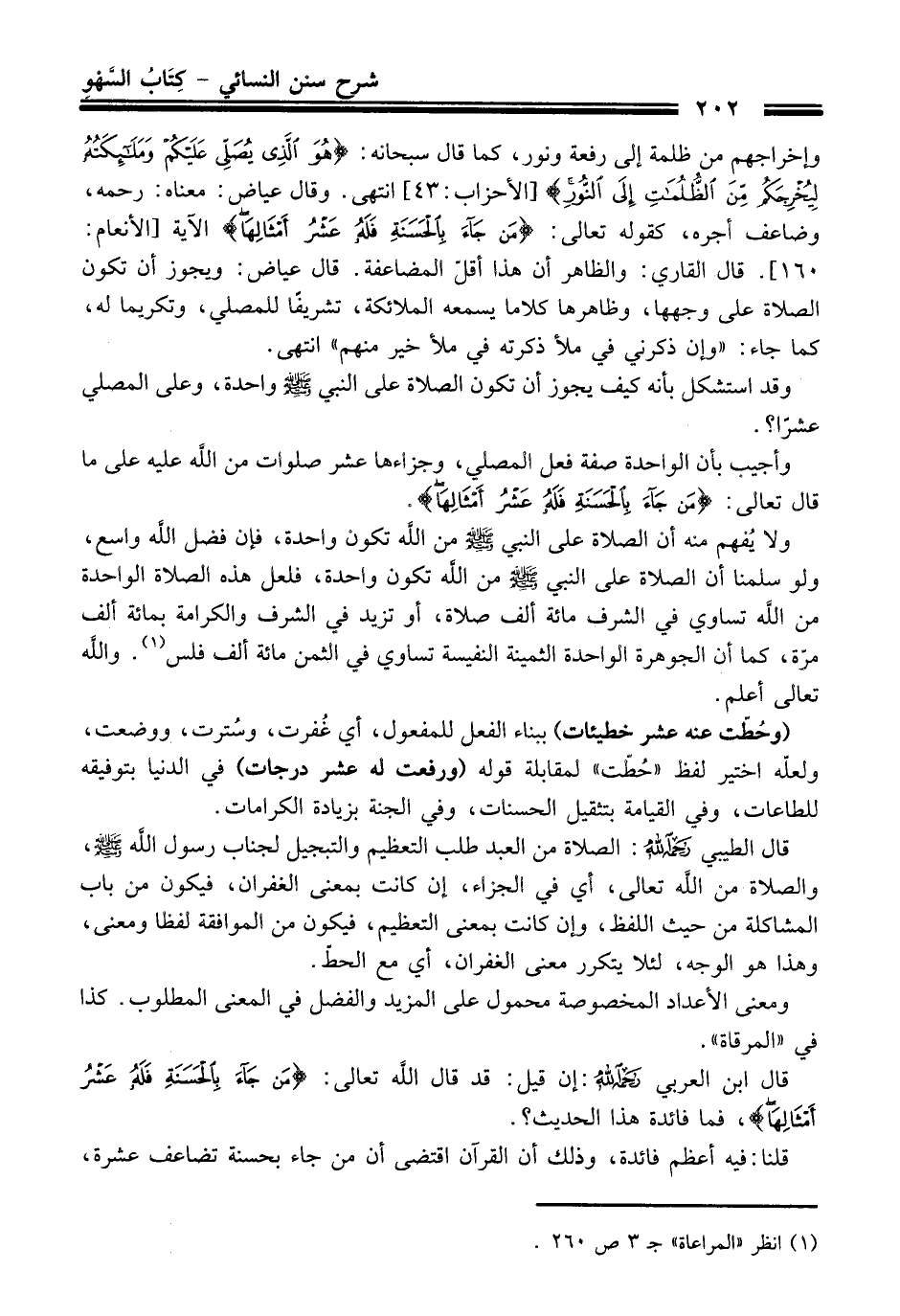 وإخراجهم من ظلمة إلى رفعة ونور، كما قال سبحانه: {هُوَ الَّذِي يُصَلِّي عَلَيْكُمْ وَمَلَائِكَتُهُ لِيُخْرِجَكُمْ مِنَ الظُّلُمَاتِ إِلَى النُّورِ} [الأحزاب: 43] انتهى. وقال عياض: معناه: رحمه، وضاعف أجره، كقوله تعالى: {مَنْ جَاءَ بِالْحَسَنَةِ فَلَهُ عَشْرُ} الآية [الأنعام: 160]. قال القاري: والظاهر أن هذا أقلّ المضاعفة. قال عياض: ويجوز أن تكون الصلاة على وجهها، وظاهرها كلاما يسمعه الملائكة، تشريفاً للمصلي، وتكريماً له، كما جاء: "وإن ذكرني في ملأ ذكرته في ملأ خير منهم" انتهى.