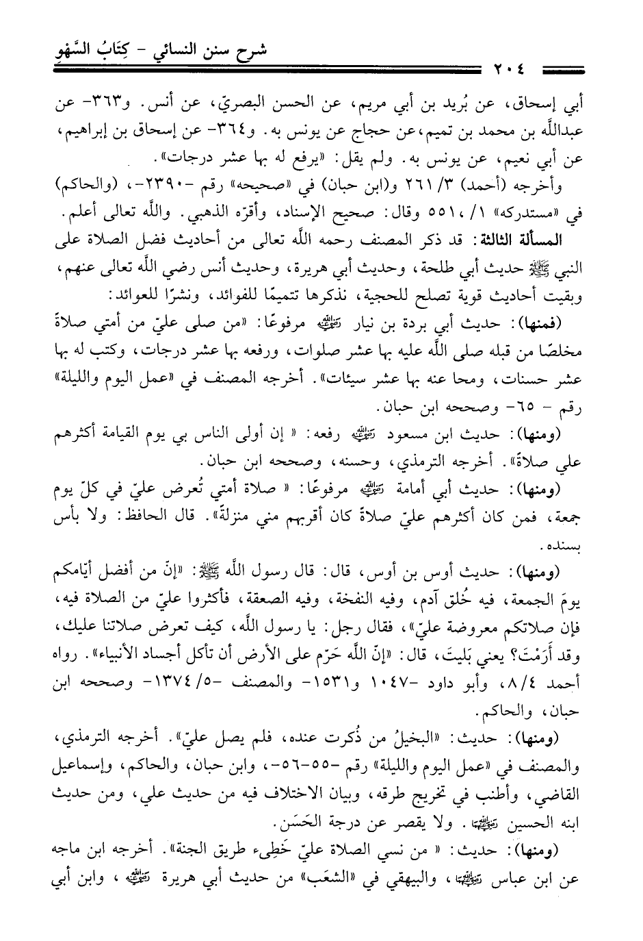 المسألة الثالثة: قد ذكر المصنف رحمه الله تعالى من أحاديث فضل الصلاة على النبي -صلى الله عليه وسلم- حديث أبي طلحة، وحديث أبي هريرة، وحديث أنس رضي الله تعالى عنهم، وبقيت أحاديث قوية تصلح للحجية، نذكرها تتميماً للفوائد، ونشرًا للعوائد: