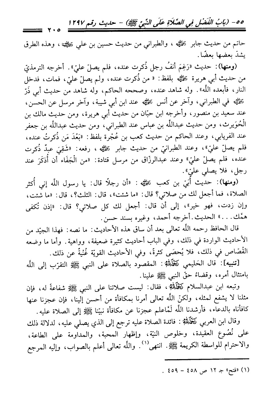 (ومنها): حديث "رَغِمَ أنفُ رجل ذكرت عنده، فلم يصلّ عليّ". أخرجه الترمذيّ من حديث أبي هريرة -رضي الله عنه- بلفظ: "من ذُكرت عنده، ولم يصلّ علي، فمات، فدخل النار، فأبعده الله". وله شاهد عنده، وصححه الحاكم، وله شاهد من حديث أبي ذَرّ -رضي الله عنه- في الطبراني، وآخر عن أنس -رضي الله عنه- عند ابن أبي شيبة، وآخر مرسل عن الحسن، عند سعيد بن منصور، وأخرجه ابن حبّان من حديث أبي هريرة، ومن حديث مالك بن الْحُوَيرث، ومن حديث عبد الله بن عباس عند الطبراني، ومن حديث عبد الله بن جعفر عند الفريابي، وعند الحاكم من حديث كعب بن عُجْرة بلفظ: "بَعُد مَن ذُكرتُ عنده، فلم يصلّ عليّ"، وعند الطبرانيّ من حديث جابر -رضي الله عنه-، رفعه: "شَقِيَ عبدٌ ذُكرت عنده، فلم يصلّ عليّ" وعند عبد الرزّاق من مرسل قتادة: "من الْجَفَاء أن أُذكَرَ عند رجل، فلا يصلي عليّ".