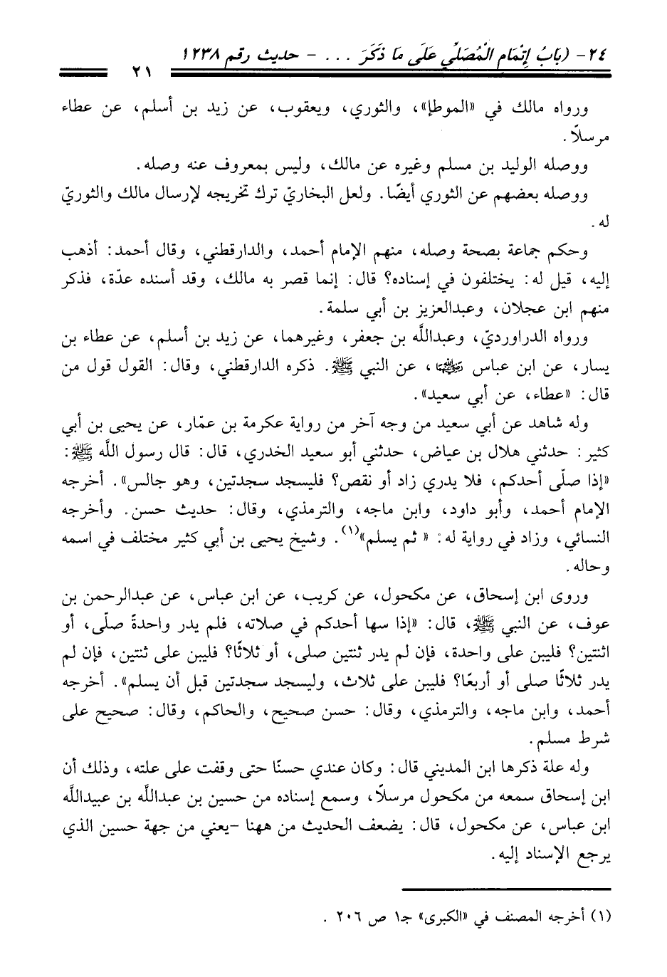 ورواه الدراورديّ، وعبد الله بن جعفر، وغيرهما، عن زيد بن أسلم، عن عطاء بن يسار، عن ابن عباس - رضي الله عنهما -، عن النبي - صلى الله عليه وسلم -. ذكره الدارقطني، وقال: القول قول من قال: "عطاء، عن أبي سعيد".