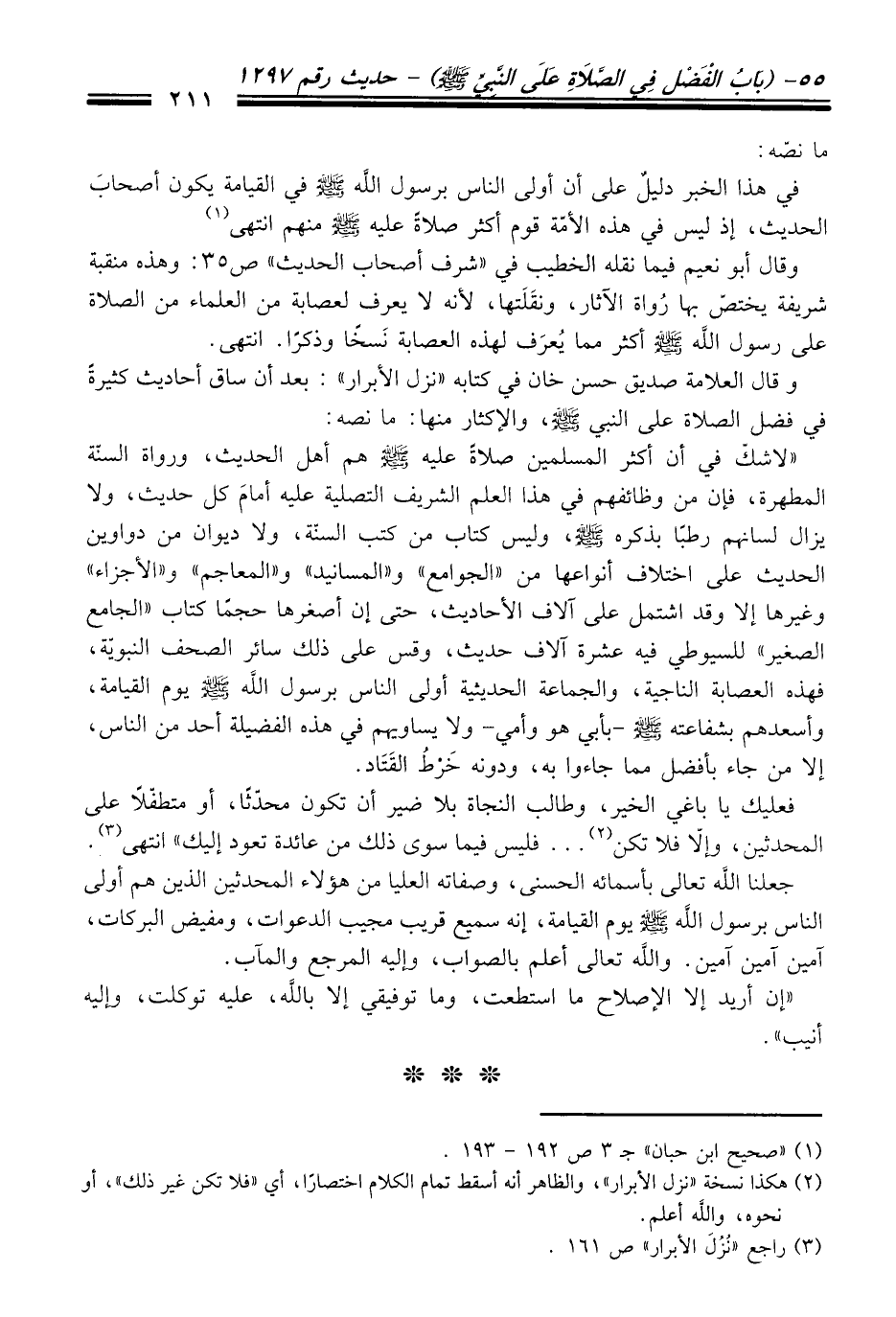 وقال العلامة صديق حسن خان في كتابه "نزل الأبرار": بعد أن ساق أحاديث كثيرةً في فضل الصلاة على النبي -صلى الله عليه وسلم-، والإكثار منها: ما نصه: