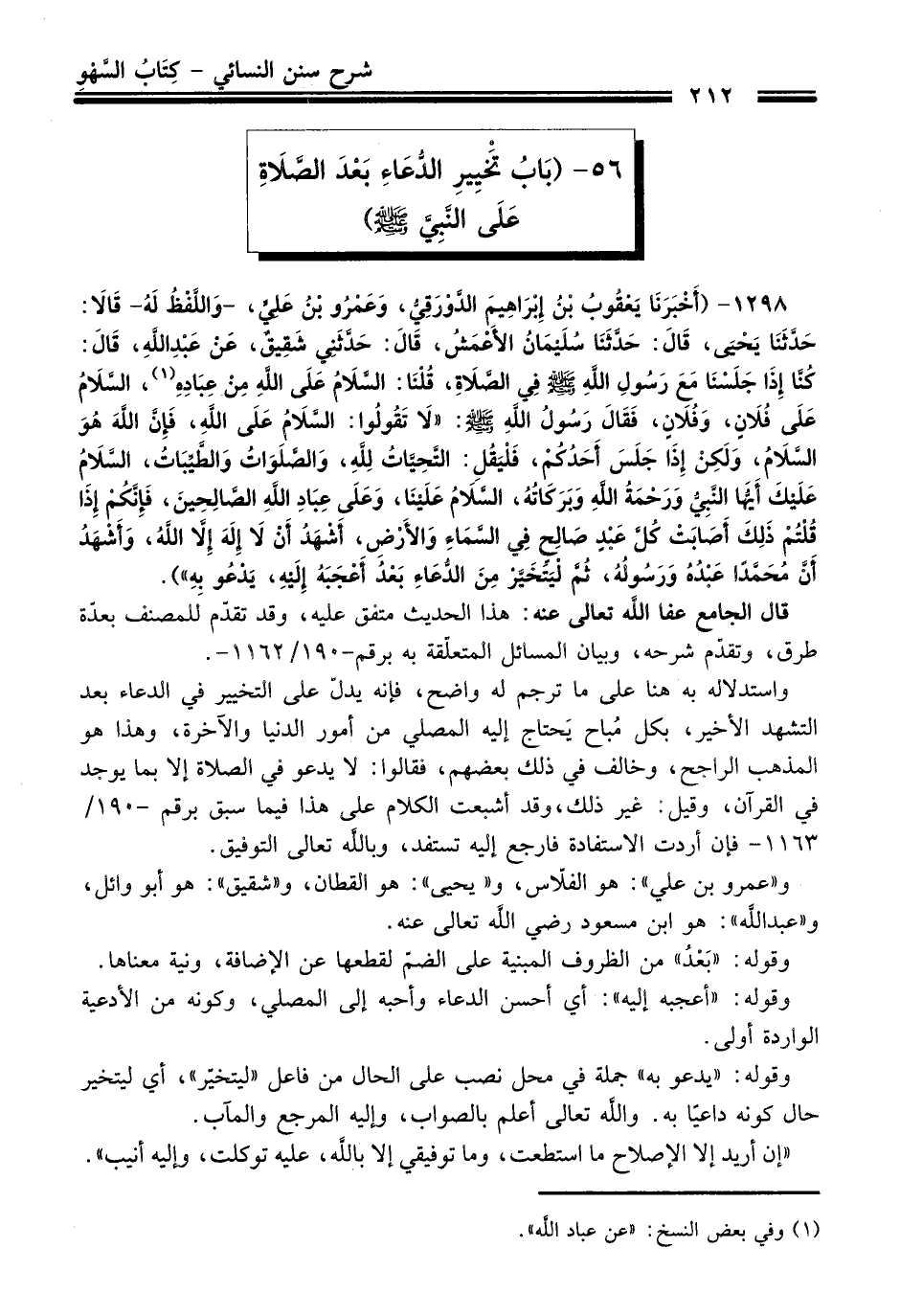 1298 - (أَخْبَرَنَا يَعْقُوبُ بْنُ إِبْرَاهِيمَ الدَّوْرَقِيُّ، وَعَمْرُو بْنُ عَلِيٍّ، -وَاللَّفْظُ لَهُ- قَالاَ: حَدَّثَنَا يَحْيَى، قَالَ: حَدَّثَنَا سُلَيْمَانُ الأَعْمَشُ، قَالَ: حَدَّثَنِي شَقِيقٌ، عَنْ عَبْدِ اللَّهِ، قَالَ: كُنَّا إِذَا جَلَسْنَا مَعَ رَسُولِ اللَّهِ -صلى الله عليه وسلم- فِي الصَّلاَةِ، قُلْنَا: السَّلاَمُ عَلَى اللَّهِ مِنْ عِبَادِهِ (¬1) السَّلاَمُ عَلَى فُلاَنٍ، وَفُلاَنٍ، فَقَالَ رَسُولُ اللَّهِ -صلى الله عليه وسلم-: "لاَ تَقُولُوا: السَّلاَمُ عَلَى اللَّهِ، فَإِنَّ اللَّهَ هُوَ السَّلاَمُ، وَلَكِنْ إِذَا جَلَسَ أَحَدُكُمْ، فَلْيَقُلِ: التَّحِيَّاتُ لِلَّهِ، وَالصَّلَوَاتُ وَالطَّيِّبَاتُ، السَّلاَمُ عَلَيْكَ أَيُّهَا النَّبِيُّ وَرَحْمَةُ اللَّهِ وَبَرَكَاتُهُ، السَّلاَمُ عَلَيْنَا، وَعَلَى عِبَادِ اللَّهِ الصَّالِحِينَ، فَإِنَّكُمْ إِذَا قُلْتُمْ ذَلِكَ أَصَابَتْ كُلَّ عَبْدٍ صَالِحٍ فِي السَّمَاءِ وَالأَرْضِ، أَشْهَدُ أَنْ لاَ إِلَهَ إِلاَّ اللَّهُ، وَأَشْهَدُ أَنَّ مُحَمَّدًا عَبْدُهُ وَرَسُولُهُ، ثُمَّ لْيَتَخَيَّرْ مِنَ الدُّعَاءِ بَعْدُ أَعْجَبَهُ إِلَيْهِ، يَدْعُو بِهِ").