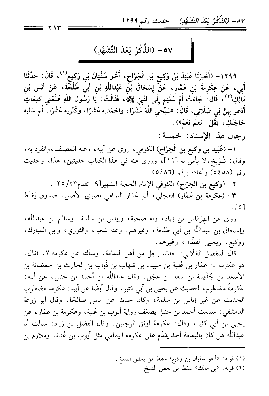 1299 - (أَخْبَرَنَا عُبَيْدُ بْنُ وَكِيعِ بْنِ الْجَرَّاحِ، أَخُو سُفْيَانَ بْنِ وَكِيعٍ (¬1)، قَالَ: حَدَّثَنَا أَبِي، عَنْ عِكْرِمَةَ بْنِ عَمَّارٍ، عَنْ إِسْحَاقَ بْنِ عَبْدِ اللَّهِ بْنِ أَبِي طَلْحَةَ، عَنْ أَنَسِ بْنِ مَالِكٍ (¬2)، قَالَ: جَاءَتْ أُمُّ سُلَيْمٍ إِلَى النَّبِيِّ -صلى الله عليه وسلم- فَقَالَتْ: يَا رَسُولَ اللَّهِ عَلِّمْنِي كَلِمَاتٍ أَدْعُو بِهِنَّ فِي صَلاَتِي، قَالَ: "سَبِّحِي اللَّهَ عَشْرًا، وَاحْمَدِيهِ عَشْرًا، وَكَبِّرِيهِ عَشْرًا، ثُمَّ سَلِيهِ حَاجَتَكِ، يَقُلْ: نَعَمْ نَعَمْ").