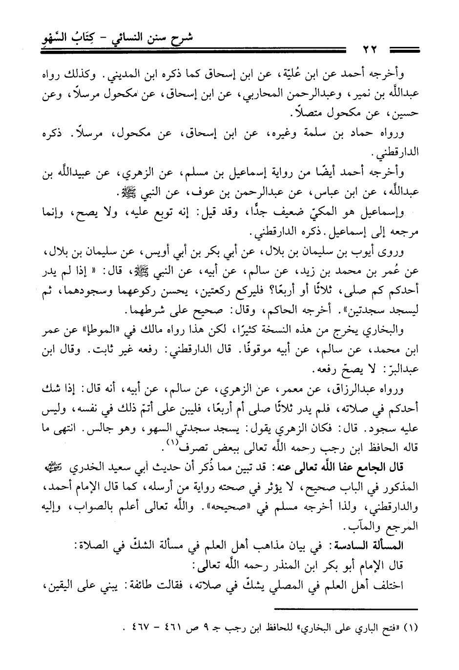 ورواه عبد الرزاق، عن معمر، عن الزهري، عن سالم، عن أبيه، أنه قال: إذا شك أحدكم في صلاته، فلم يدر ثلاثًا صلى أم أربعًا، فليبن على أتمّ ذلك في نفسه، وليس عليه سجود. قال: فكان الزهري يقول: يسجد سجدتي السهو، وهو جالس. انتهى ما قاله الحافظ ابن رجب رحمه الله تعالى ببعض تصرف (¬1).