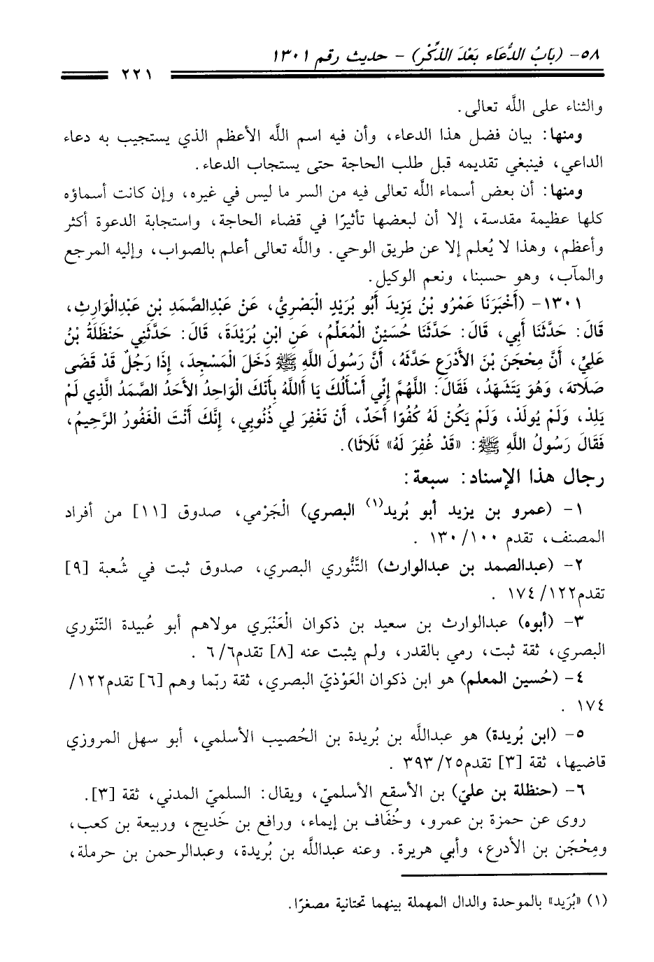 1301 - (أَخْبَرَنَا عَمْرُو بْنُ يَزِيدَ أَبُو بُرَيْدٍ الْبَصْرِيُّ، عَنْ عَبْدِ الصَّمَدِ بْنِ عَبْدِ الْوَارِثِ، قَالَ: حَدَّثَنَا أَبِي، قَالَ: حَدَّثَنَا حُسَيْنٌ الْمُعَلِّمُ، عَنِ ابْنِ بُرَيْدَةَ، قَالَ: حَدَّثَنِي حَنْظَلَةُ بْنُ عَلِيٍّ، أَنَّ مِحْجَنَ بْنَ الأَدْرَعِ حَدَّثَهُ، أَنَّ رَسُولَ اللَّهِ -صلى الله عليه وسلم- دَخَلَ الْمَسْجِدَ، إِذَا رَجُلٌ قَدْ قَضَى صَلاَتَهُ، وَهُوَ يَتَشَهَّدُ، فَقَالَ: اللَّهُمَّ إِنِّي أَسْأَلُكَ يَا اللَّهُ بِأَنَّكَ الْوَاحِدُ الأَحَدُ الصَّمَدُ الَّذِي لَمْ يَلِدْ، وَلَمْ يُولَدْ، وَلَمْ يَكُنْ لَهُ كُفُوًا أَحَدٌ، أَنْ تَغْفِرَ لِي ذُنُوبِي، إِنَّكَ أَنْتَ الْغَفُورُ الرَّحِيمُ، فَقَالَ رَسُولُ اللَّهِ -صلى الله عليه وسلم-: "قَدْ غُفِرَ لَهُ" ثَلاَثًا).