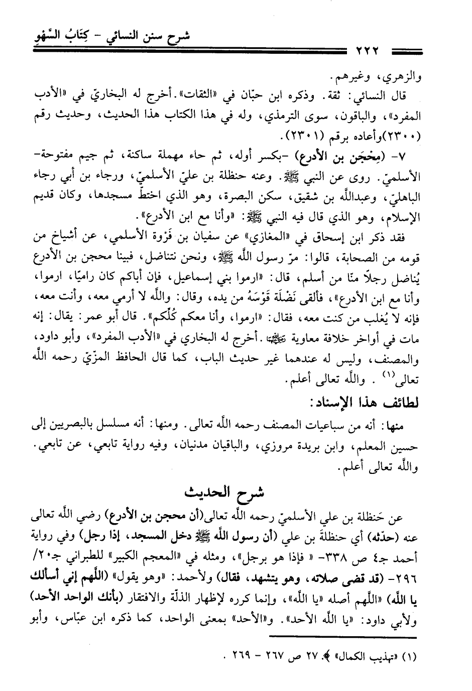 عن حَنظلة بن علي الأسلميّ رحمه الله تعالى (أن محجن بن الأدرع) رضي الله تعالى عنه (حدّثه) أي حنظلةَ بن علي (أن رسول الله -صلى الله عليه وسلم- دخل المسجد، إذا رجل) وفي رواية أحمد جـ 4 ص 338 - "فإذا هو برجل"، ومثله في "المعجم الكبير" للطبراني جـ 20/ 296 - (قد قضى صلاته، وهو يتشهد، فقال) ولأحمد: "وهو يقول" (اللَّهم إني أسالك يا الله) "اللَّهم أصله "يا الله"، وإنما كرره لإظهار الذلّة والافتقار (بأنك الواحد الأحد) ولأبي داود: "يا الله الأحد". و"الأحد" بمعنى الواحد، كما ذكره ابن عبّاس، وأبو