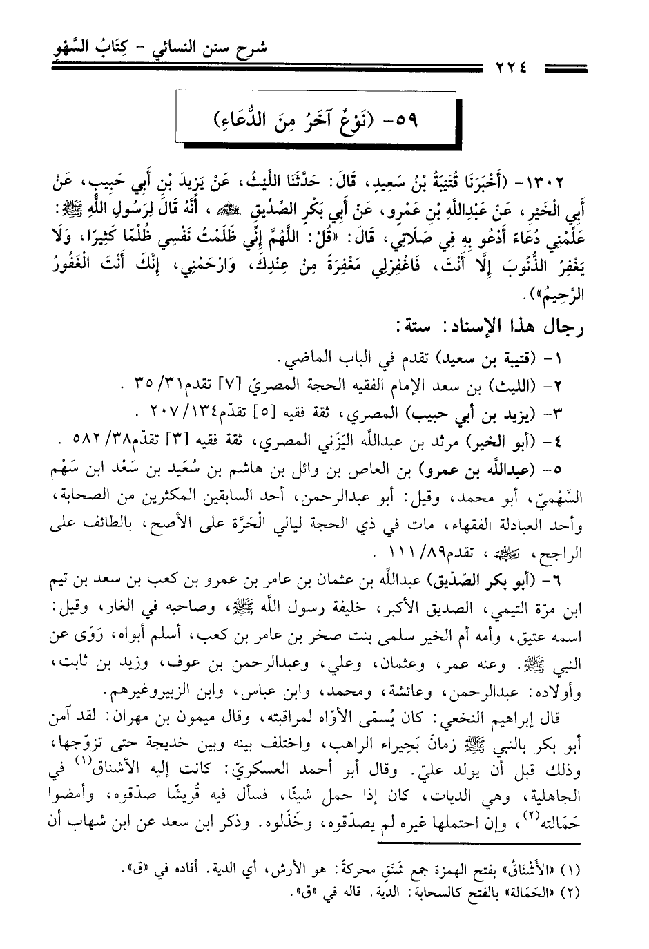 1302 - (أَخْبَرَنَا قُتَيْبَةُ بْنُ سَعِيدٍ، قَالَ: حَدَّثَنَا اللَّيْثُ، عَنْ يَزِيدَ بْنِ أَبِي حَبِيبٍ، عَنْ أَبِي الْخَيْرِ، عَنْ عَبْدِ اللَّهِ بْنِ عَمْرٍو، عَنْ أَبِي بَكْرٍ الصِّدِّيقِ -رضى الله عنهم-، أَنَّهُ قَالَ لِرَسُولِ اللَّهِ -صلى الله عليه وسلم-: عَلِّمْنِي دُعَاءً أَدْعُو بِهِ فِي صَلاَتِي، قَالَ: "قُلِ اللَّهُمَّ إِنِّي ظَلَمْتُ نَفْسِي ظُلْمًا كَثِيرًا، وَلاَ يَغْفِرُ الذُّنُوبَ إِلاَّ أَنْتَ، فَاغْفِرْ لِي مَغْفِرَةً مِنْ عِنْدِكَ، وَارْحَمْنِي، إِنَّكَ أَنْتَ الْغَفُورُ الرَّحِيمُ").