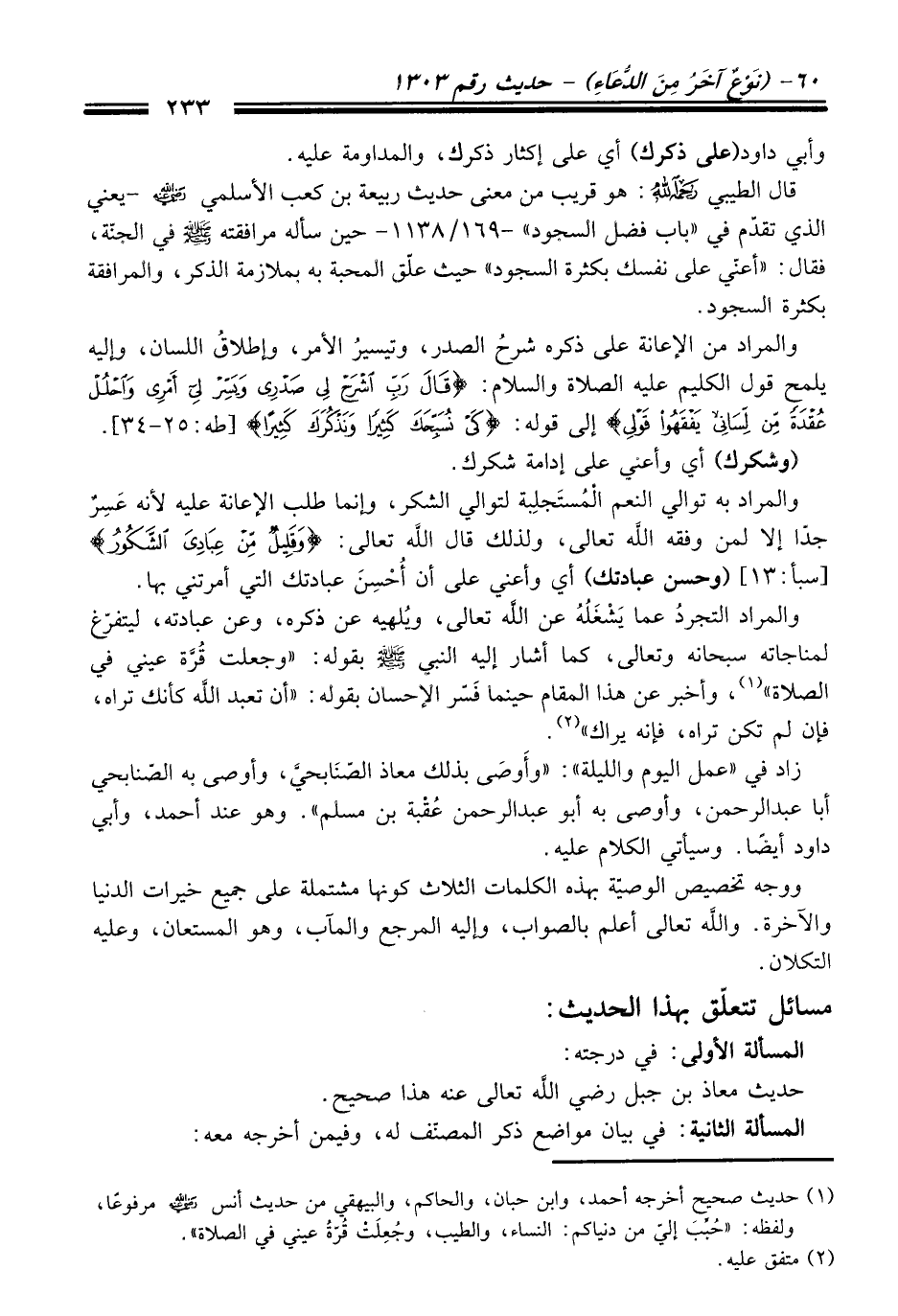 زاد في "عمل اليوم والليلة": "وأَوصَى بذلك معاذ الصّنَابحيَّ، وأوصى به الصّنابحي أبا عبد الرحمن، وأوصى به أبو عبد الرحمن عُقْبة بن مسلم". وهو عند أحمد، وأبي داود أيضاً. وسيأتي الكلام عليه.