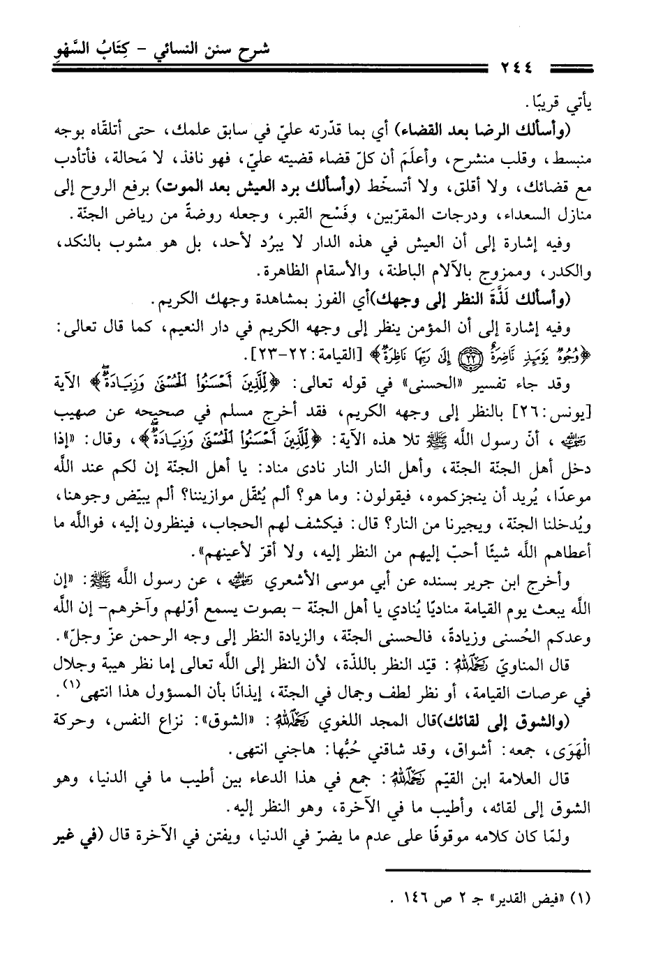 قال المناوي رحمه الله: قيد النظر باللذّة، لأن النظر إلى الله تعالى إما نظر هيبة وجلال في عرصات القيامة، أو نظر لطف وجمال في الجنّة، إيذاناً بأن المسؤول هذا انتهى (¬1).