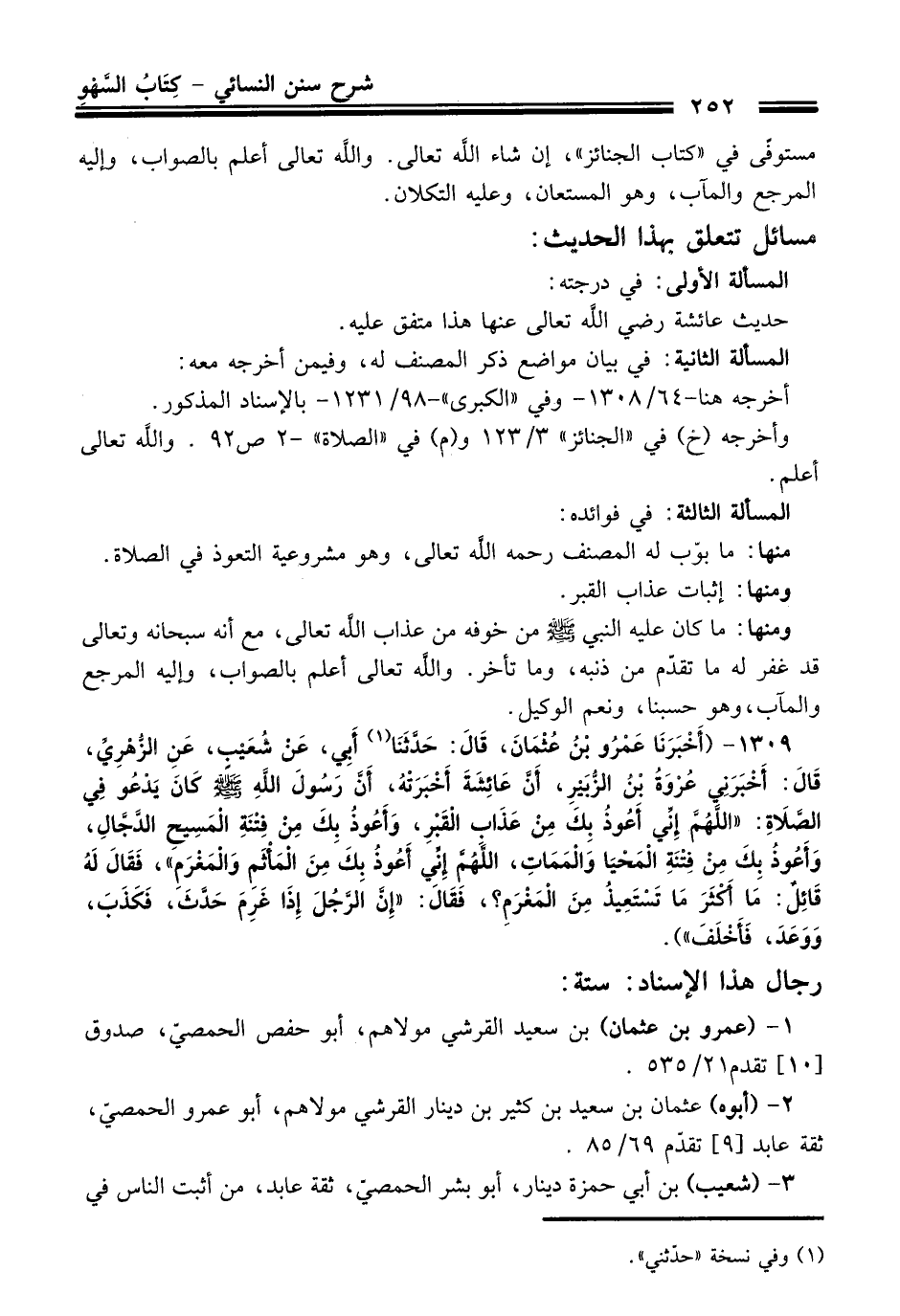 1309 - (أَخْبَرَنَا عَمْرُو بْنُ عُثْمَانَ، قَالَ: حَدَّثَنَا (¬1) أَبِي، عَنْ شُعَيْبٍ، عَنِ الزُّهْرِيِّ، قَالَ: أَخْبَرَنِي عُرْوَةُ بْنُ الزُّبَيْرِ، أَنَّ عَائِشَةَ أَخْبَرَتْهُ، أَنَّ رَسُولَ اللَّهِ -صلى الله عليه وسلم- كَانَ يَدْعُو فِي الصَّلاَةِ: «"للَّهُمَّ إِنِّي أَعُوذُ بِكَ مِنْ عَذَابِ الْقَبْرِ، وَأَعُوذُ بِكَ مِنْ فِتْنَةِ الْمَسِيحِ الدَّجَّالِ، وَأَعُوذُ بِكَ مِنْ فِتْنَةِ الْمَحْيَا وَالْمَمَاتِ، اللَّهُمَّ إِنِّي أَعُوذُ بِكَ مِنَ الْمَأْثَمِ وَالْمَغْرَمِ"، فَقَالَ لَهُ قَائِلٌ: مَا أَكْثَرَ مَا تَسْتَعِيذُ مِنَ الْمَغْرَمِ؟ فَقَالَ: "إِنَّ الرَّجُلَ إِذَا غَرِمَ حَدَّثَ، فَكَذَبَ وَوَعَدَ فَأَخْلَفَ").
