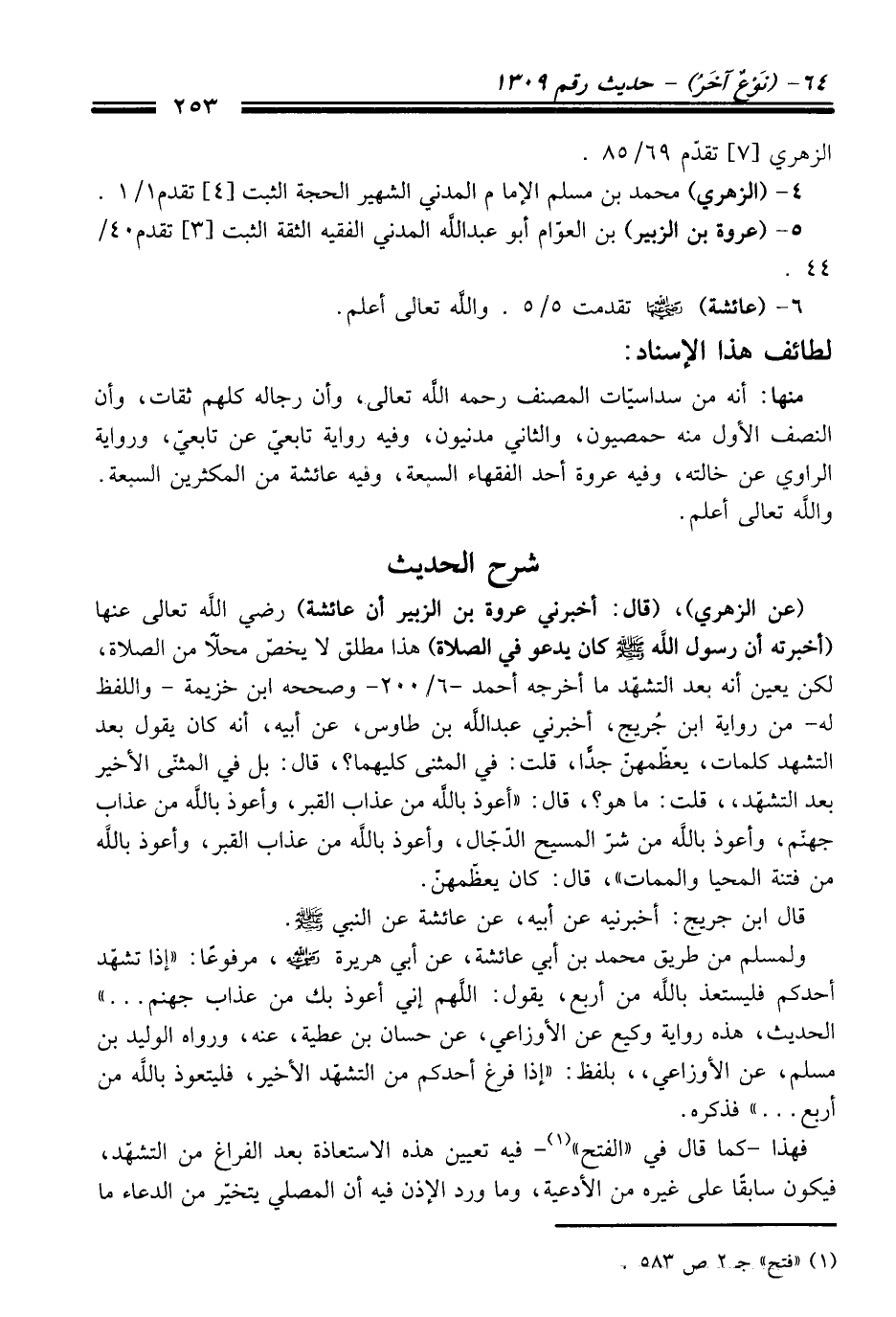 ولمسلم من طريق محمد بن أبي عائشة، عن أبي هريرة -رضي الله عنه-، مرفوعًا: "إذا تشهّد أحدكم فليستعذ بالله من أربع، يقول: اللَّهم إني أعوذ بك من عذاب جهنم ... " الحديث، هذه رواية وكيع عن الأوزاعي، عن حسان بن عطية، عنه، ورواه الوليد بن مسلم، عن الأوزاعي،، بلفظ: "إذا فرغ أحدكم من التشهّد الأخير، فليتعوذ بالله من أربع ... " فذكره.