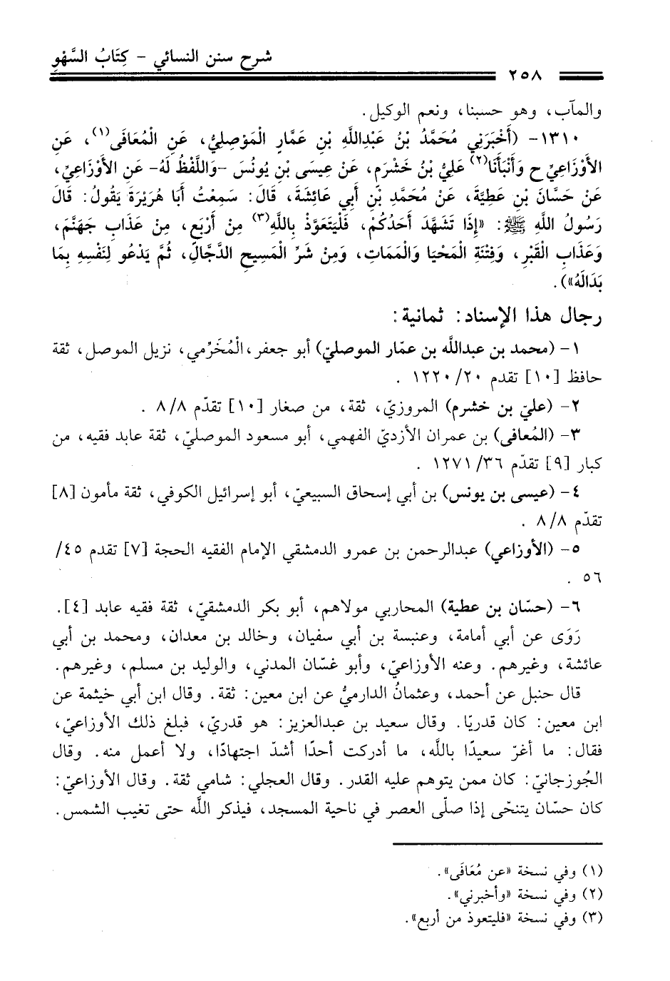 1310 - (أَخْبَرَنِي مُحَمَّدُ بْنُ عَبْدِ اللَّهِ بْنِ عَمَّارٍ الْمَوْصِلِيُّ، عَنِ الْمُعَافَى (¬1)، عَنِ الأَوْزَاعِيِّ ح وَأَنْبَأَنَا (¬2) عَلِيُّ بْنُ خَشْرَمٍ، عَنْ عِيسَى بْنِ يُونُسَ -وَاللَّفْظُ لَهُ- عَنِ الأَوْزَاعِيِّ، عَنْ حَسَّانَ بْنِ عَطِيَّةَ، عَنْ مُحَمَّدِ بْنِ أَبِي عَائِشَةَ، قَالَ: سَمِعْتُ أَبَا هُرَيْرَةَ يَقُولُ: قَالَ رَسُولُ اللَّهِ -صلى الله عليه وسلم-: "إِذَا تَشَهَّدَ أَحَدُكُمْ فَلْيَتَعَوَّذْ بِاللَّهِ (¬3) مِنْ أَرْبَعٍ، مِنْ عَذَابِ جَهَنَّمَ، وَعَذَابِ الْقَبْرِ، وَفِتْنَةِ الْمَحْيَا وَالْمَمَاتِ، وَمِنْ شَرِّ الْمَسِيحِ الدَّجَّالِ، ثُمَّ يَدْعُو لِنَفْسِهِ بِمَا بَدَا لَهُ").