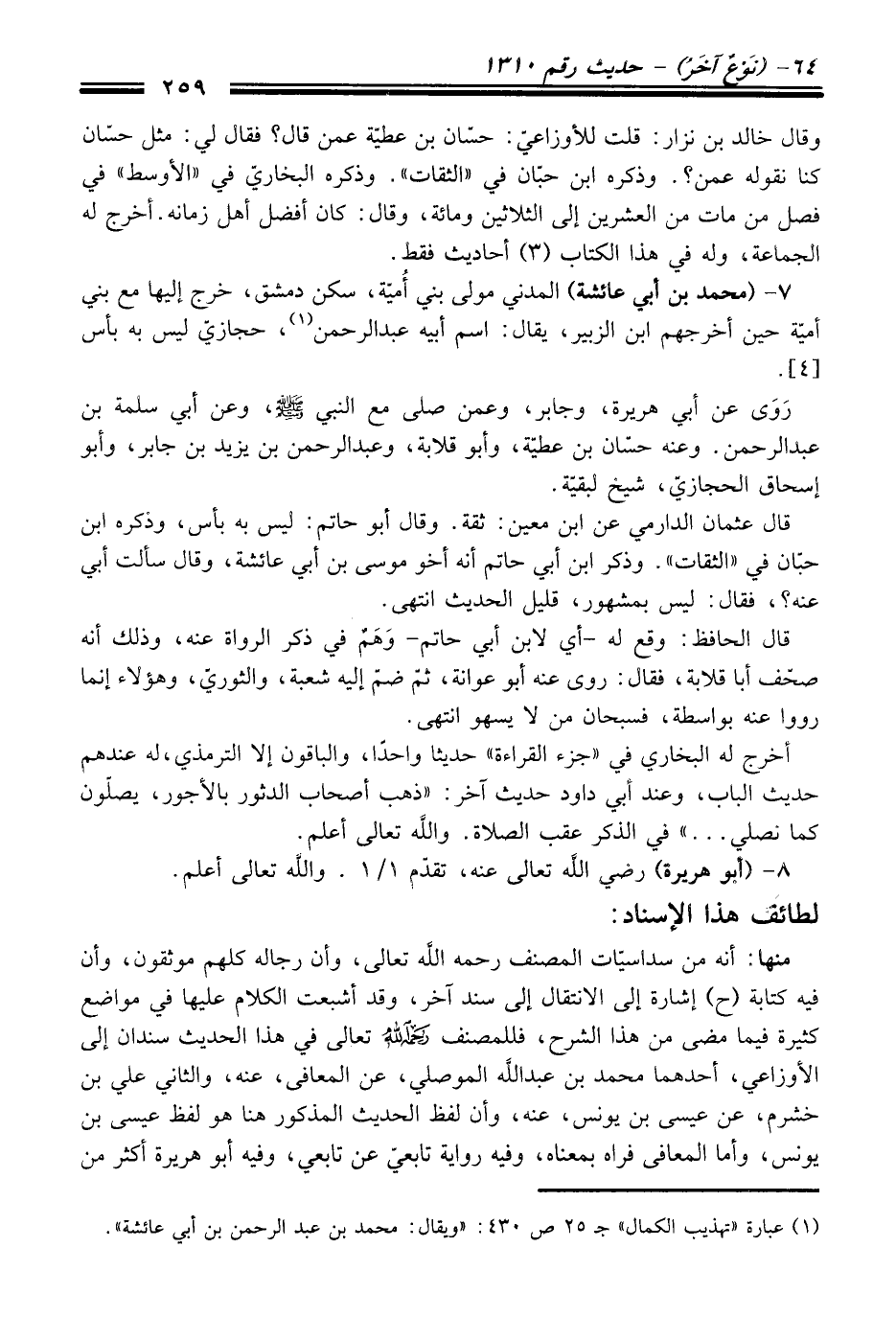 منها: أنه من سداسيّات المصنف رحمه الله تعالى، وأن رجاله كلهم موثقون، وأن فيه كتابة (ح) إشارة إلى الانتقال إلى سند آخر، وقد أشبعت الكلام عليها في مواضع كثيرة فيما مضى من هذا الشرح، فللمصنف رحمه الله تعالى في هذا الحديث سندان إلى الأوزاعي، أحدهما محمد بن عبد الله الموصلي، عن المعافى، عنه، والثاني علي بن خشرم، عن عيسى بن يونس، عنه، وأن لفظ الحديث المذكور هنا هو لفظ عيسى بن يونس، وأما المعافى فرواه بمعناه، وفيه رواية تابعيّ عن تابعي، وفيه أبو هريرة أكثر من