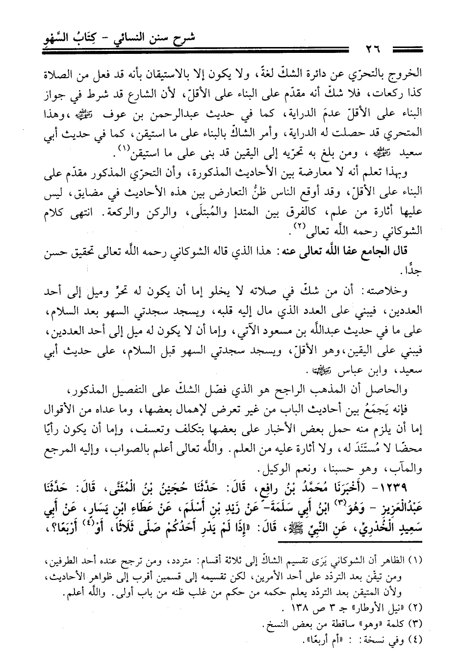 وبهذا تعلم أنه لا معارضة بين الأحاديث المذكورة، وأن التحرّي المذكور مقدّم على البناء على الأقلّ، وقد أوقع الناس ظنُّ التعارض بين هذه الأحاديث في مضايق، ليس عليها أثارة من علم، كالفرق بين الْمُبْتَدَإِ وَالْمُبْتَلَى، والركن والركعة. انتهى كلام الشوكاني رحمه الله تعالى (¬2).