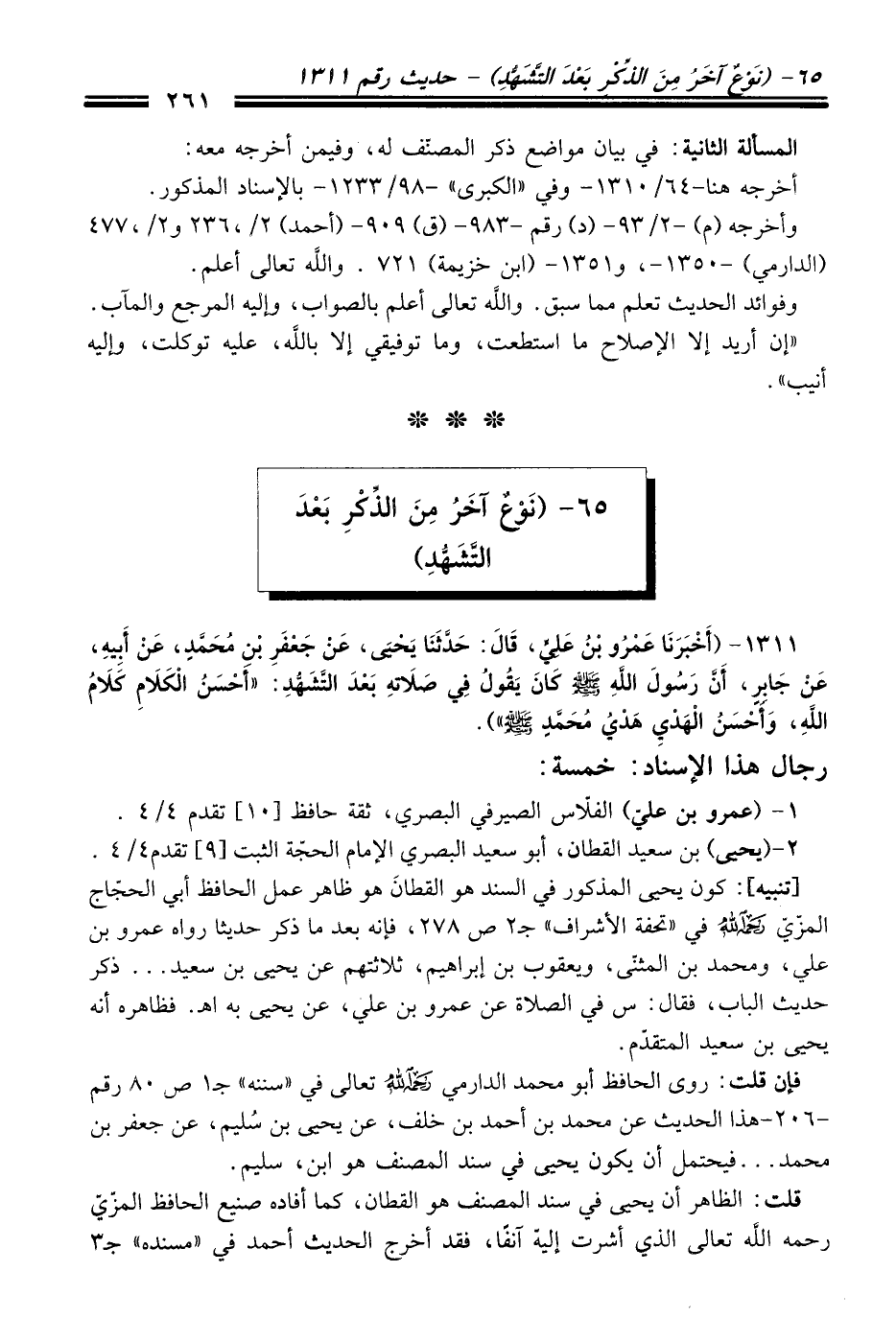 1311 - (أَخْبَرَنَا عَمْرُو بْنُ عَلِيٍّ، قَالَ: حَدَّثَنَا يَحْيَى، عَنْ جَعْفَرِ بْنِ مُحَمَّدٍ، عَنْ أَبِيهِ، عَنْ جَابِرٍ، أَنَّ رَسُولَ اللَّهِ -صلى الله عليه وسلم- كَانَ يَقُولُ فِي صَلاَتِهِ بَعْدَ التَّشَهُّدِ: "أَحْسَنُ الْكَلاَمِ كَلاَمُ اللَّهِ، وَأَحْسَنُ الْهَدْي هَدْيُ مُحَمَّدٍ -صلى الله عليه وسلم-").