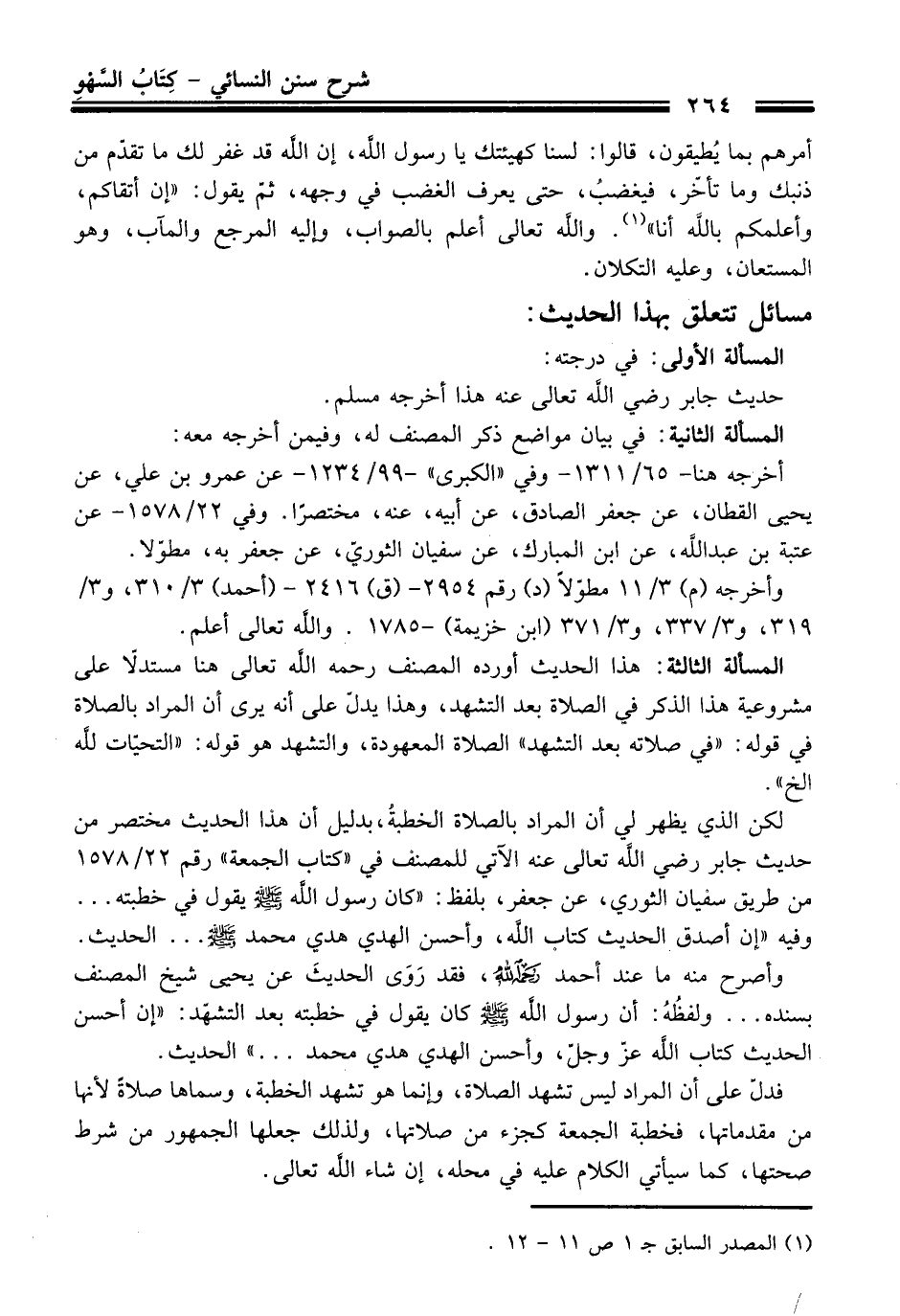 وأصرح منه ما عند أحمد رحمه الله، فقد رَوَى الحديثَ عن يحيى شيخ المصنف بسنده ... ولفظُهُ: أن رسول الله -صلى الله عليه وسلم- كان يقول في خطبته بعد التشهّد: "إن أحسن الحديث كتاب الله عزّ وجلّ، وأحسن الهدي هدي محمد ... " الحديث.