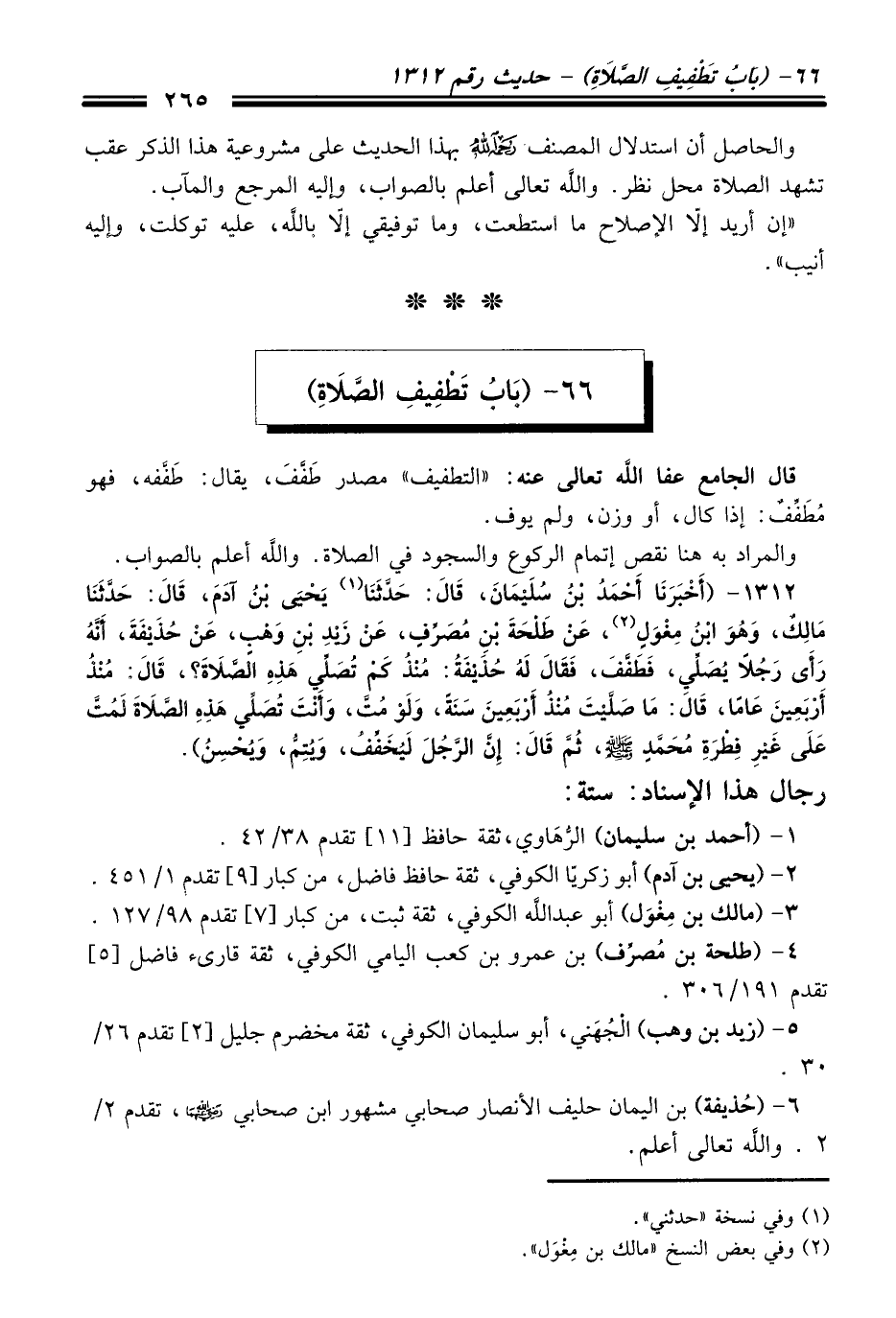 1312 - (أَخْبَرَنَا أَحْمَدُ بْنُ سُلَيْمَانَ، قَالَ: حَدَّثَنَا (¬1) يَحْيَى بْنُ آدَمَ، قَالَ: حَدَّثَنَا مَالِكٌ، وَهُوَ ابْنُ مِغْوَلٍ (¬2)، عَنْ طَلْحَةَ بْنِ مُصَرِّفٍ، عَنْ زَيْدِ بْنِ وَهْبٍ، عَنْ حُذَيْفَةَ، أَنَّهُ رَأَى رَجُلاً يُصَلِّي، فَطَفَّفَ، فَقَالَ لَهُ حُذَيْفَةُ: مُنْذُ كَمْ تُصَلِّي هَذِهِ الصَّلاَةَ؟ قَالَ: مُنْذُ أَرْبَعِينَ عَامًا، قَالَ: مَا صَلَّيْتُ مُنْذُ أَرْبَعِينَ سَنَةً، وَلَوْ مِتَّ، وَأَنْتَ تُصَلِّي هَذِهِ الصَّلاَةَ لَمِتَّ عَلَى غَيْرِ فِطْرَةِ مُحَمَّدٍ -صلى الله عليه وسلم- ثُمَّ قَالَ: إِنَّ الرَّجُلَ لَيُخَفِّفُ، وَيُتِمُّ وَيُحْسِنُ).