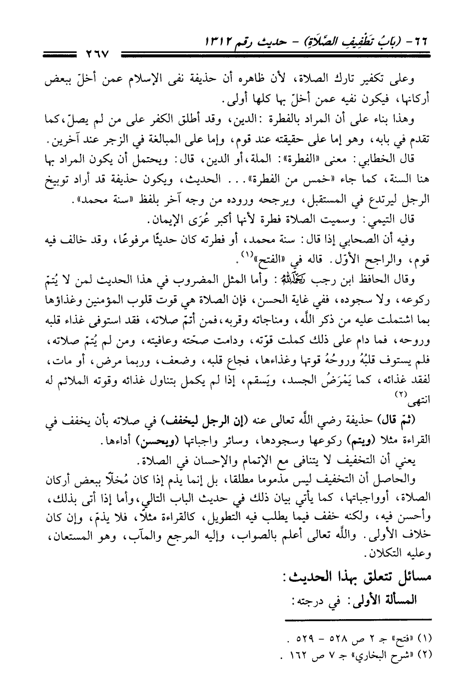 وعلى تكفير تارك الصلاة، لأن ظاهره أن حذيفة نفى الإسلام عمن أخلّ ببعض أركانها، فيكون نفيه عمن أخلّ بها كلها أولى.