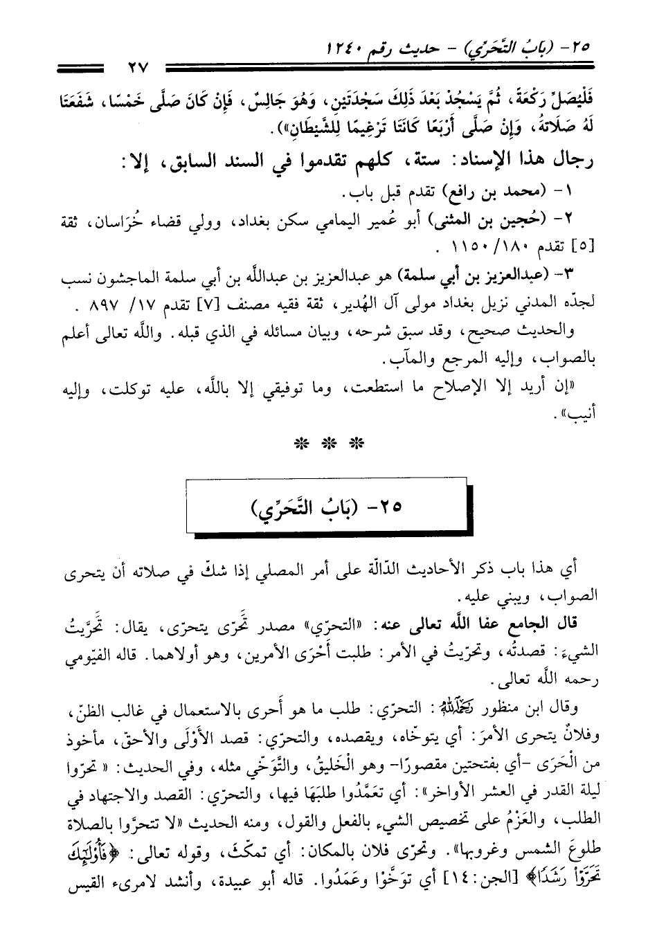 قال الجامع عفا الله تعالى عنه: "التحرّي" مصدر تَحَرّى يتحرّى يقال: تَحرَّيتُ الشيءَ: قصدتُه، وتحرّيتُ في الأمر: طلبت أَحْرَى الأمرين، وهو أولاهما. قاله الفيومي رحمه الله تعالى.