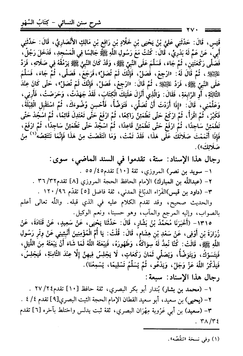 قَيْسٍ، قَالَ: حَدَّثَنِي عَلِيُّ بْنُ يَحْيَى بْنِ خَلاَّدِ بْنِ رَافِعِ بْنِ مَالِكٍ الأَنْصَارِيُّ، قَالَ: حَدَّثَنِي أَبِي، عَنْ عَمٍّ لَهُ بَدْرِيٍّ، قَالَ: كُنْتُ مَعَ رَسُولِ اللَّهِ -صلى الله عليه وسلم- جَالِسًا فِي الْمَسْجِدِ، فَدَخَلَ رَجُلٌ، فَصَلَّى رَكْعَتَيْنِ، ثُمَّ جَاءَ، فَسَلَّمَ عَلَى النَّبِيِّ -صلى الله عليه وسلم-، وَقَدْ كَانَ النَّبِيُّ -صلى الله عليه وسلم- يَرْمُقُهُ فِي صَلاَتِهِ، فَرَدَّ عَلَيْهِ السَّلاَمَ، ثُمَّ قَالَ لَهُ: "ارْجِعْ، فَصَلِّ، فَإِنَّكَ لَمْ تُصَلِّ"، فَرَجَعَ فَصَلَّى، ثُمَّ جَاءَ، فَسَلَّمَ عَلَى النَّبِيِّ -صلى الله عليه وسلم-، فَرَدَّ عَلَيْهِ السَّلاَمَ، ثُمَّ قَالَ: "ارْجِعْ، فَصَلِّ، فَإِنَّكَ لَمْ تُصَلِّ"، حَتَّى كَانَ عِنْدَ الثَّالِثَةِ، أَوِ الرَّابِعَةِ، فَقَالَ: وَالَّذِي أَنْزَلَ عَلَيْكَ الْكِتَابَ، لَقَدْ جَهِدْتُ، وَحَرَصْتُ، فَأَرِنِي، وَعَلِّمْنِي، قَالَ: "إِذَا أَرَدْتَ أَنْ تُصَلِّيَ، فَتَوَضَّأْ، فَأَحْسِنْ وُضُوءَكَ، ثُمَّ اسْتَقْبِلِ الْقِبْلَةَ، فَكَبِّرْ، ثُمَّ اقْرَأْ، ثُمَّ ارْكَعْ حَتَّى تَطْمَئِنَّ رَاكِعًا، ثُمَّ ارْفَعْ حَتَّى تَعْتَدِلَ قَائِمًا، ثُمَّ اسْجُدْ حَتَّى تَطْمَئِنَّ سَاجِدًا، ثُمَّ ارْفَعْ حَتَّى تَطْمَئِنَّ قَاعِدًا، ثُمَّ اسْجُدْ حَتَّى تَطْمَئِنَّ سَاجِدًا، ثُمَّ ارْفَعْ، فَإِذَا أَتْمَمْتَ صَلاَتَكَ عَلَى هَذَا، فَقَدْ تَمَّتْ، وَمَا انْتَقَصْتَ مِنْ هَذَا فَإِنَّمَا تَنْتَقِصُهُ (¬1) مِنْ صَلاَتِكَ").