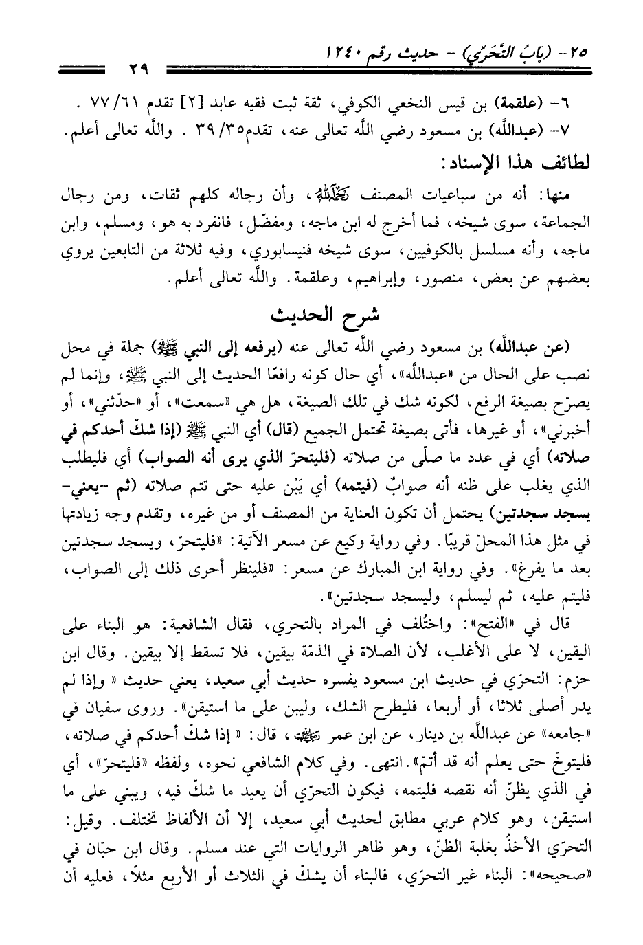 قال في "الفتح": واختُلف في المراد بالتحري، فقال الشافعية: هو البناء على اليقين، لا على الأغلب، لأن الصلاة في الذمّة بيقين، فلا تسقط إلا بيقين. وقال ابن حزم: التحرّي في حديث ابن مسعود يفسره حديث أبي سعيد، يعني حديث "وإذا لم يدر أصلى ثلاثًا، أو أربعًا، فليطرح الشك، وليبن على ما استيقن". وروى سفيان في "جامعه" عن عبد الله بن دينار، عن ابن عمر - رضي الله عنهما -، قال: "إذا شكّ أحدكم في صلاته، فليتوخّ حتى يعلم أنه قد أتمّ". انتهى. وفي كلام الشافعي نحوه، ولفظه "فليتحرّ"، أي في الذي يظنّ أنه نقصه فليتمه، فيكون التحرّي أن يعيد ما شكّ فيه، ويبني على ما استيقن، وهو كلام عربي مطابق لحديث أبي سعيد، إلا أن الألفاظ تختلف. وقيل: التحرّي الأخذُ بغلبة الظنّ، وهو ظاهر الروايات التي عند مسلم. وقال ابن حبّان في "صحيحه": البناء غير التحرّي، فالبناء أن يشكّ في الثلاث أو الأربع مثلًا، فعليه أن