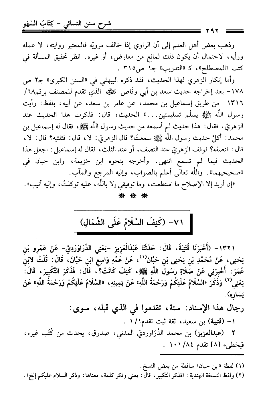 1321 - (أَخْبَرَنَا قُتَيْبَةُ، قَالَ: حَدَّثَنَا عَبْدُ الْعَزِيزِ -يَعْنِي الدَّرَاوَرْدِيَّ- عَنْ عَمْرِو بْنِ يَحْيَى، عَنْ مُحَمَّدِ بْنِ يَحْيَى بْنِ حَبَّانَ (¬1)، عَنْ عَمِّهِ وَاسِعِ بْنِ حَبَّانَ، قَالَ: قُلْتُ لاِبْنِ عُمَرَ: أَخْبِرْنِى عَنْ صَلاَةِ رَسُولِ اللَّهِ -صلى الله عليه وسلم-، كَيْفَ كَانَتْ؟ قَالَ: فَذَكَرَ التَّكْبِيرَ، قَالَ: يَعْنِي (¬2) وَذَكَرَ "السَّلاَمُ عَلَيْكُمْ وَرَحْمَةُ اللَّهِ" عَنْ يَمِينِهِ، "السَّلاَمُ عَلَيْكُمْ وَرَحْمَةُ اللَّهِ" عَنْ يَسَارِهِ).