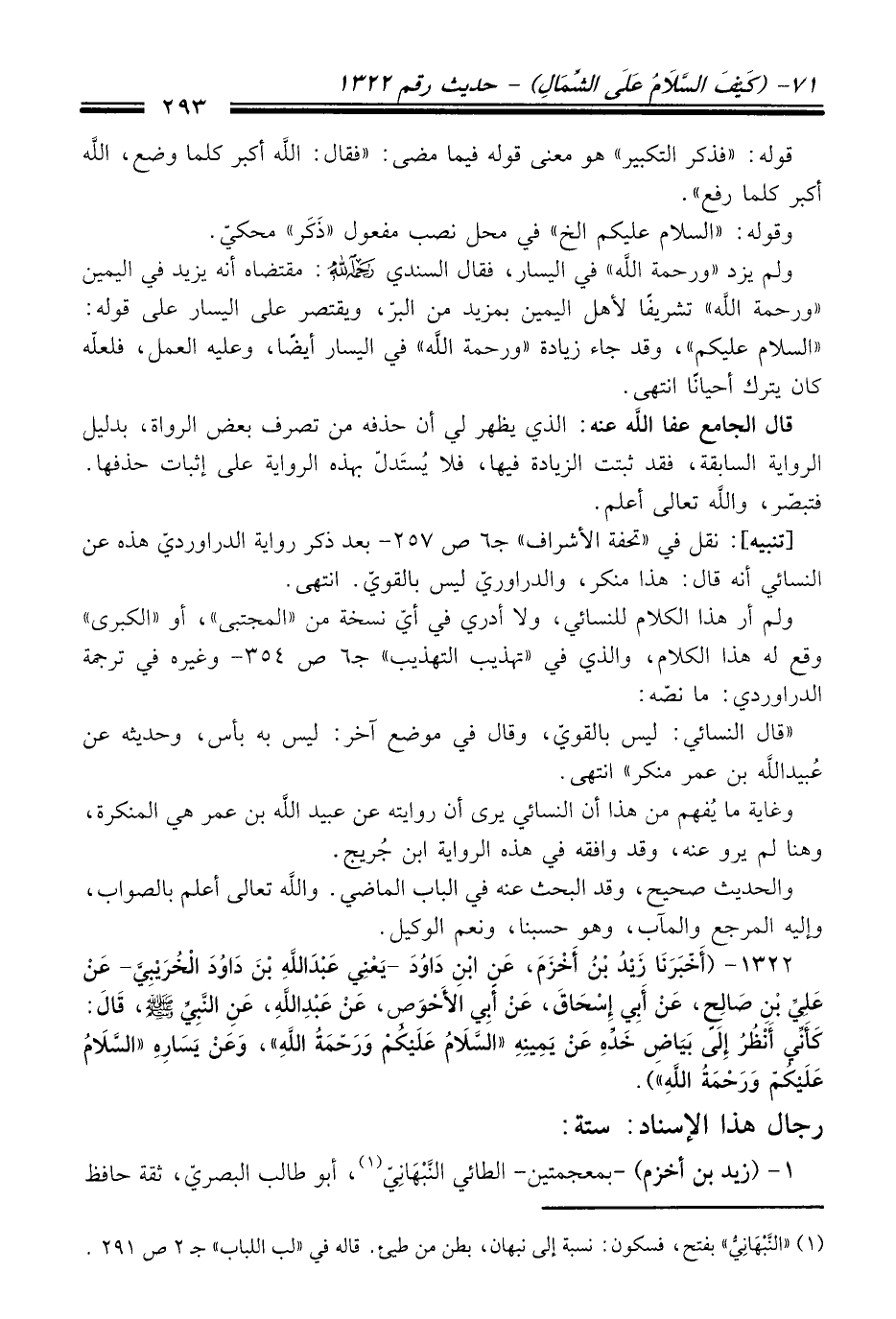 1322 - (أَخْبَرَنَا زَيْدُ بْنُ أَخْزَمَ، عَنِ ابْنِ دَاوُدَ -يَعْنِي عَبْدَ اللَّهِ بْنَ دَاوُدَ الْخُرَيْبِيَّ- عَنْ عَلِيِّ بْنِ صَالِحٍ، عَنْ أَبِي إِسْحَاقَ، عَنْ أَبِي الأَحْوَصِ، عَنْ عَبْدِ اللَّهِ، عَنِ النَّبِيِّ -صلى الله عليه وسلم-، قَالَ: كَأَنِّي أَنْظُرُ إِلَى بَيَاضِ خَدِّهِ عَنْ يَمِينِهِ "السَّلاَمُ عَلَيْكُمْ وَرَحْمَةُ اللَّهِ"، وَعَنْ يَسَارِهِ "السَّلاَمُ عَلَيْكُمْ وَرَحْمَةُ اللَّهِ").