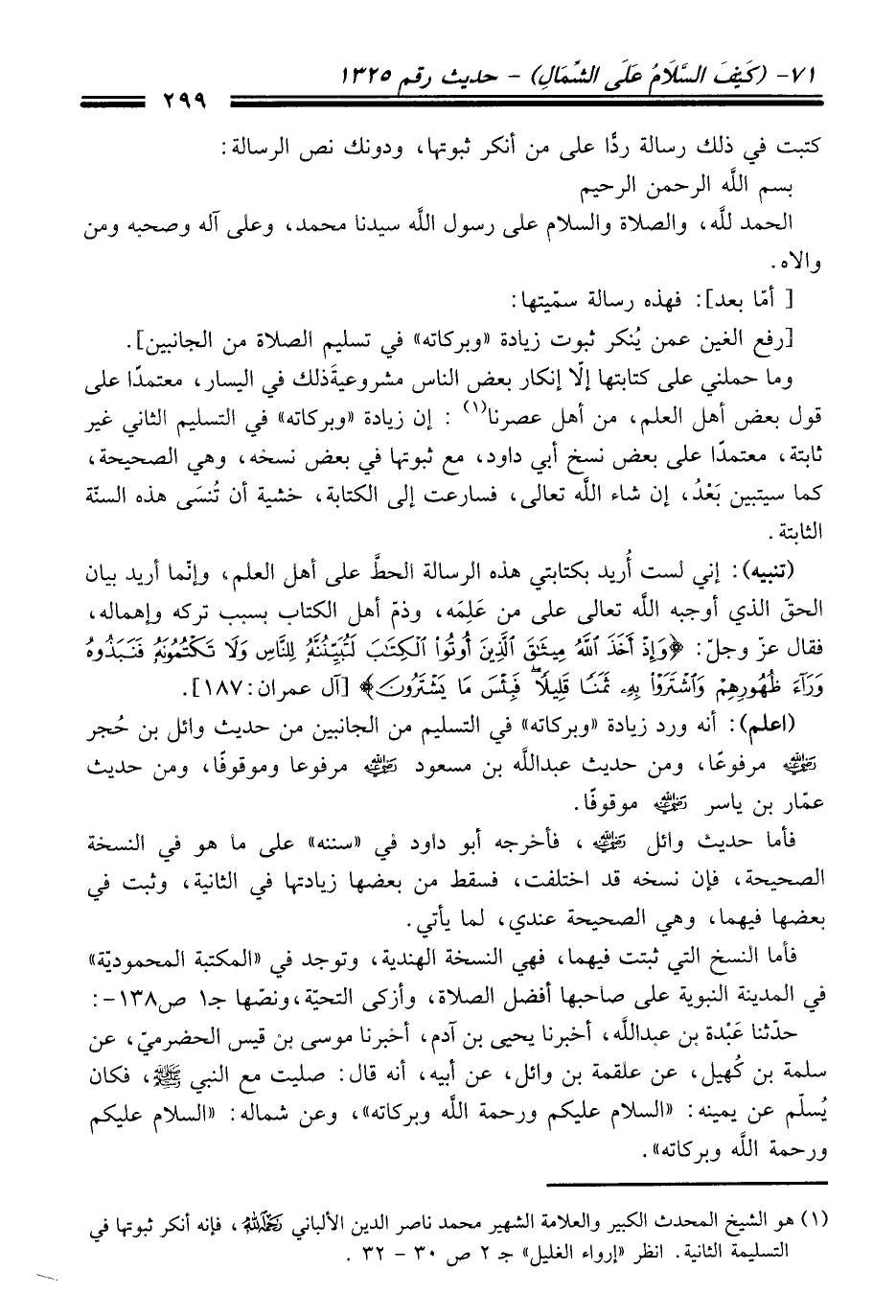 (¬1) هو الشيخ المحدث الكبير والعلامة الشهير محمد ناصر الدين الألباني رحمه الله، فإنه أنكر ثبوتها في التسليمة الثانية. انظر "إرواء الغليل" جـ 2 ص 30 - 32.