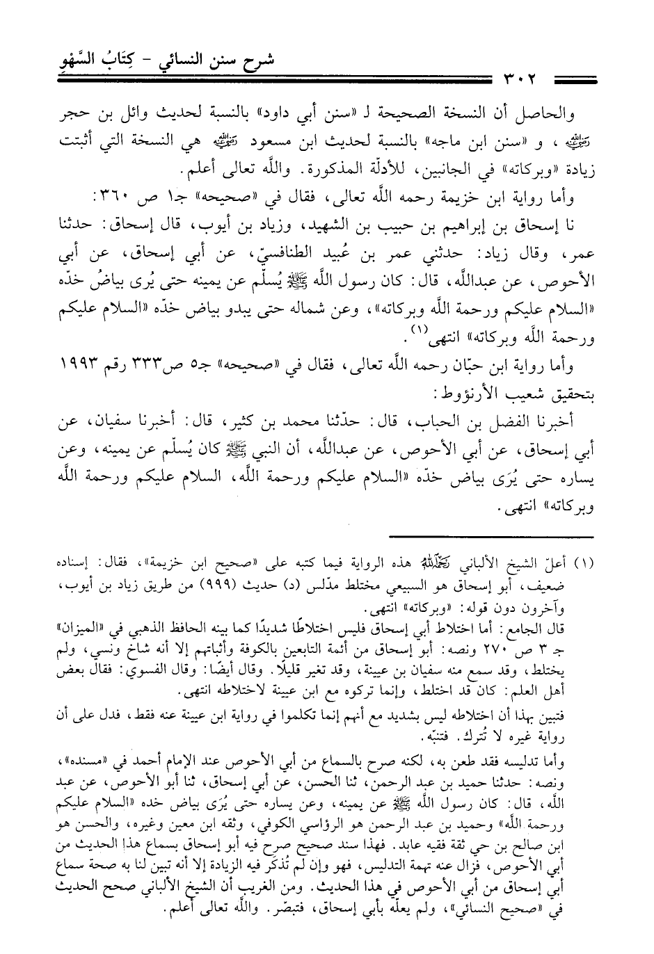 وأما تدليسه فقد طعن به، لكنه صرح بالسماع من أبي الأحوص عند الإمام أحمد في "مسنده"، ونصه: حدثنا حميد بن عبد الرحمن، ثنا الحسن، عن أبي إسحاق، ثنا أبو الأحوص، عن عبد الله، قال: كان رسول الله -صلى الله عليه وسلم- عن يمينه، وعن يساره حتى يُرى بياض خده "السلام عليكم ورحمة الله" وحميد بن عبد الرحمن هو الرؤاسي الكوفي، وثقه ابن معين وغيره، والحسن هو ابن صالح بن حي ثقة فقيه عابد. فهذا سند صحيح صرح فيه أبو إسحاق بسماع هذا الحديث من أبي الأحوص، فزال عنه تهمة التدليس، فهو وإن لم تُذكر فيه الزيادة إلا أنه تبين لنا به صحة سماع أبي إسحاق من أبي الأحوص في هذا الحديث. ومن الغريب أن الشيخ الألباني صحح الحديث في "صحيح النسائي"، ولم يعلّه بأبي إسحاق، فتبصّر. والله تعالى أعلم.