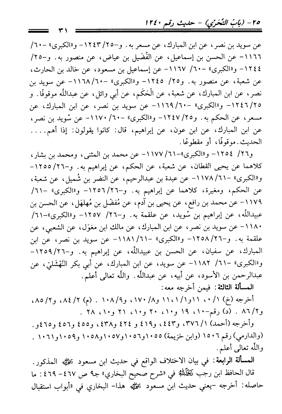 عن سويد بن نصر، عن ابن المبارك، عن مسعر به. و-25/ 1243 - و"الكبرى" -60/ 1166 - عن الحسن بن إسماعيل، عن الفُضَيل بن عياض، عن منصور به. و -25/ 1244 - و"الكبرى" -60/ 1167 - عن إسماعيل بن مسعود، عن خالد بن الحارث، عن شعبة، عن منصور به. و 25/ 1245 - و"الكبرى" -60/ 1168 - عن سويد بن نصر، عن ابن المبارك، عن شعبة، عن الْحَكَم، عن أبي وائل، عن عبد الله موقوفًا. و 25/ 1246 - و"الكبرى" -60/ 1169 - عن سويد بن نصر، عن ابن المبارك، عن مسعر، عن الحكم به. و 25/ 1247 - و"الكبرى" -60/ 1170 - عن سُويد بن نصر، عن ابن المبارك، عن ابن عون، عن إبراهيم، قال: كانوا يقولون: إذا أهم. . . . الحديث. موقوفًا، أو مقطوعًا.