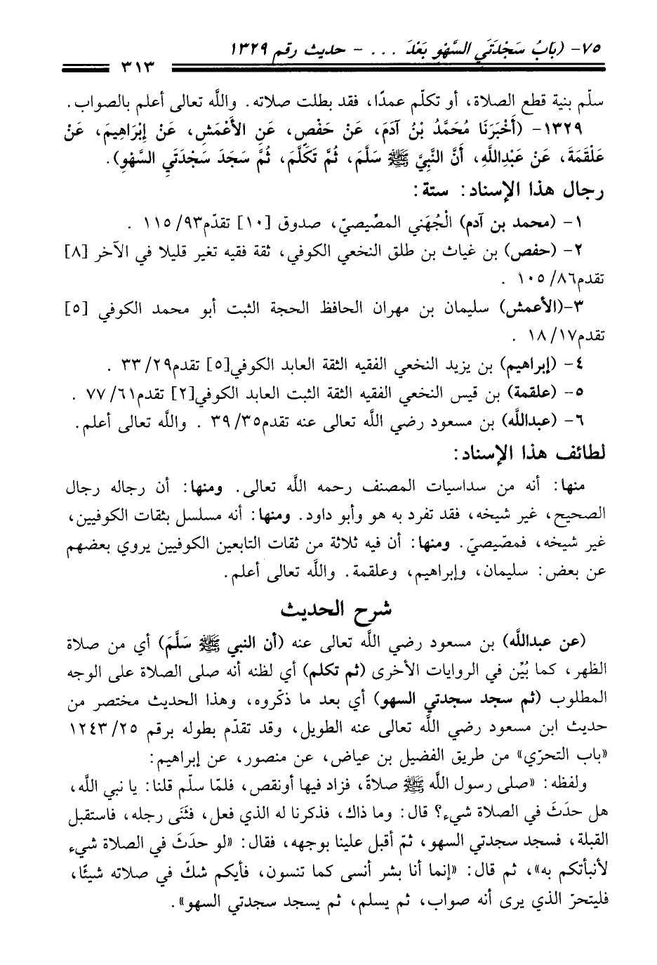 1329 - (أَخْبَرَنَا مُحَمَّدُ بْنُ آدَمَ، عَنْ حَفْصٍ، عَنِ الأَعْمَشِ، عَنْ إِبْرَاهِيمَ، عَنْ عَلْقَمَةَ، عَنْ عَبْدِ اللَّهِ، أَنَّ النَّبِيَّ -صلى الله عليه وسلم- سَلَّمَ، ثُمَّ تَكَلَّمَ، ثُمَّ سَجَدَ سَجْدَتَي السَّهْوِ).