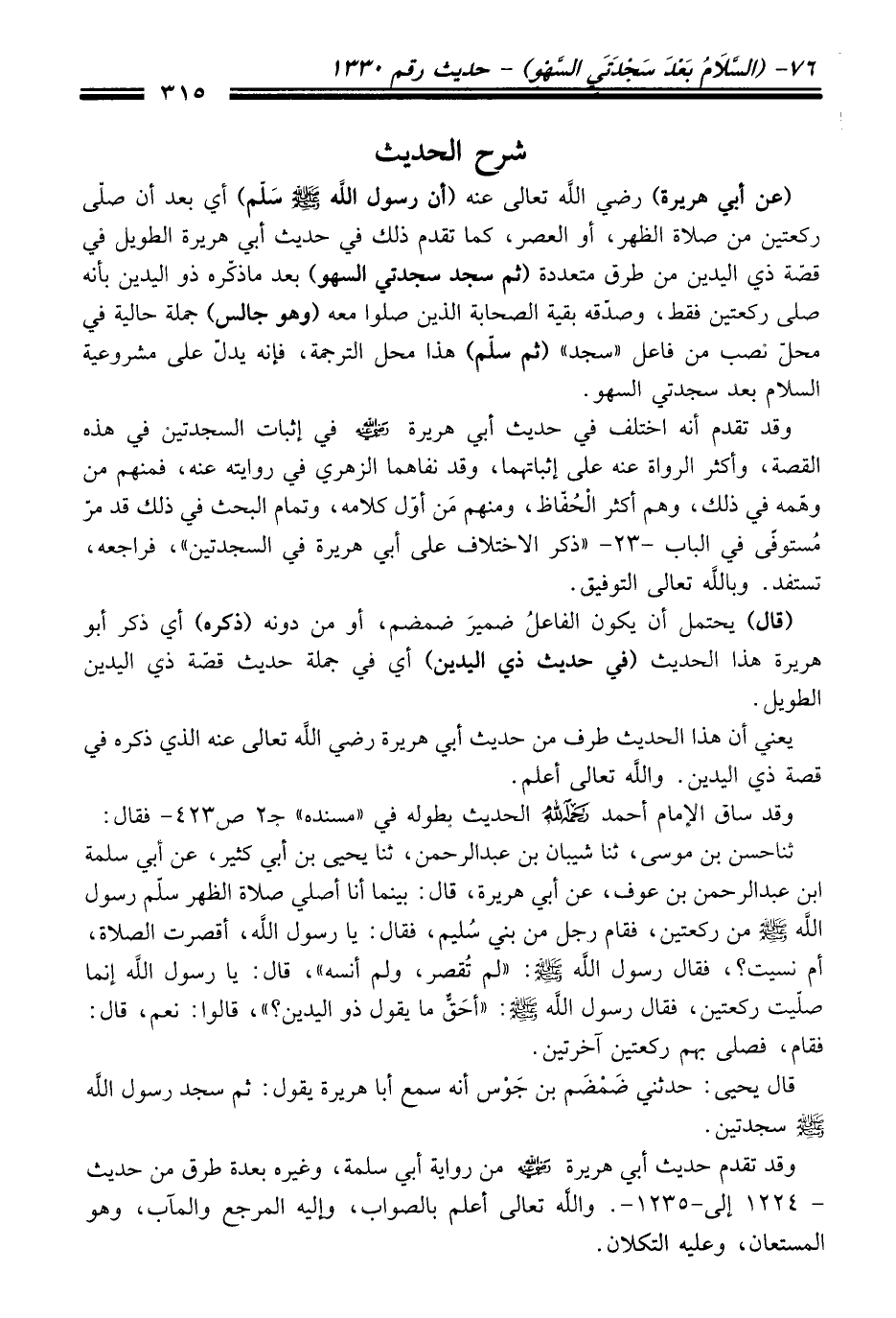 (عن أبي هريرة) رضي الله تعالى عنه (أن رسول الله -صلى الله عليه وسلم-) أي بعد أن صلّى ركعتين من صلاة الظهر، أو العصر، كما تقدم ذلك في حديث أبي هريرة الطويل في قصّة ذي اليدين من طرق متعددة (ثم سجد سجدتي السهو) بعدما ذكّره ذو اليدين بأنه صلى ركعتين فقط، وصدّقه بقية الصحابة الذين صلوا معه (وهو جالس) جملة حالية في محلّ نصب من فاعل "سجد" (ثم سلّم) هذا محل الترجمة، فإنه يدل على مشروعية السلام بعد سجدتي السهو.
