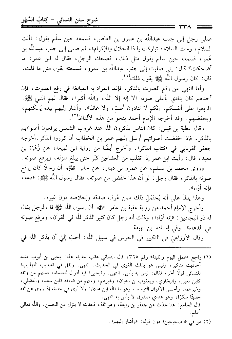 صلى رجل إلى جنب عبد الله بن عمرو بن العاص، فسمعه حين سلّم يقول: "أنت السلام، ومنك السلام، تباركت يا ذا الجلال والإكرام"، ثم صلى إلى جنب عبد الله بن عُمر، فسمعه حين سلّم يقول مثل ذلك، فضحك الرجل، فقال له ابن عمر: ما أضحكك؟ قال: إني صليت إلى جنب عبد الله بن عمرو، فسمعته يقول مثل ما قلت، قال: كان رسول الله -صلى الله عليه وسلم- يقول ذلك (¬1).