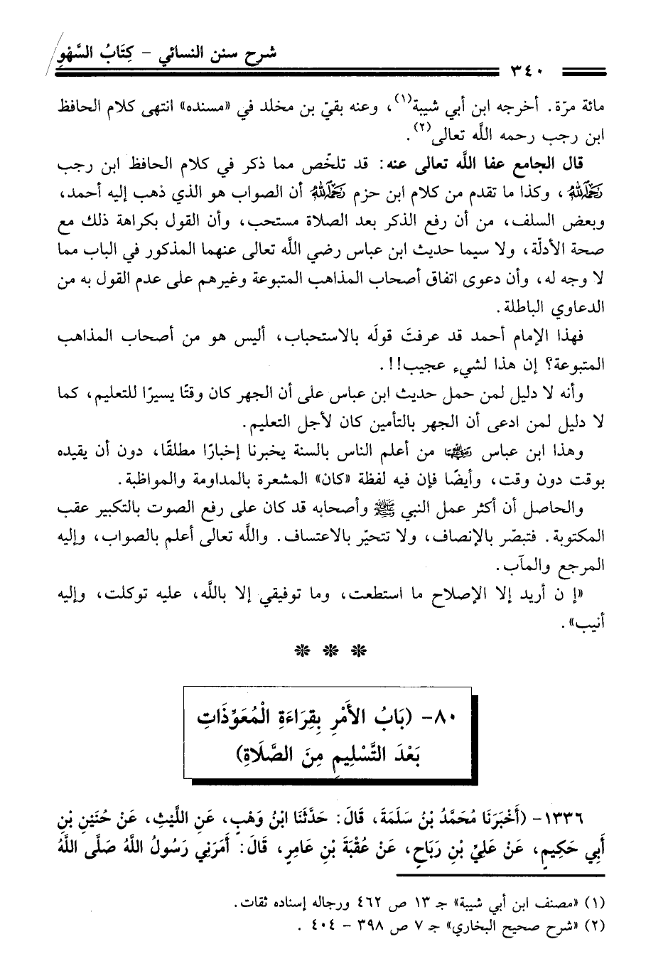 قال الجامع عفا الله تعالى عنه: قد تلخّص مما ذكر في كلام الحافظ ابن رجب رحمه الله، وكذا ما تقدم من كلام ابن حزم رحمه الله أن الصواب هو الذي ذهب إليه أحمد، وبعض السلف، من أن رفع الذكر بعد الصلاة مستحب، وأن القول بكراهة ذلك مع صحة الأدلّة، ولاسيما حديث ابن عباس رضي الله تعالى عنهما المذكور في الباب مما لا وجه له، وأن دعوى اتفاق أصحاب المذاهب المتبوعة وغيرهم على عدم القول به من الدعاوي الباطلة.