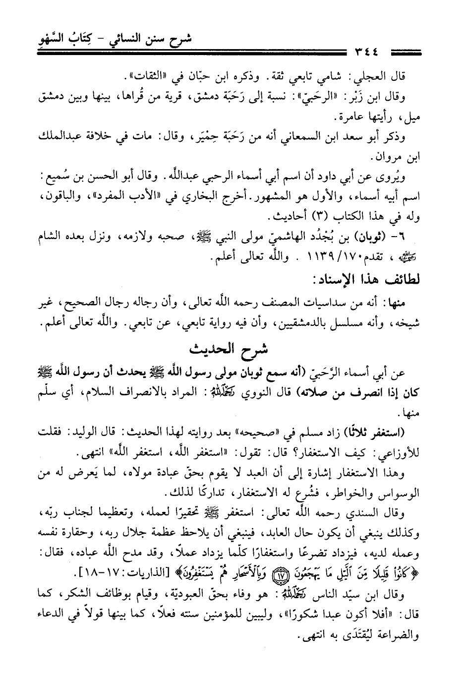 عن أبي أسماء الرَّحَبيّ (أنه سمع ثوبان مولى رسول الله -صلى الله عليه وسلم- يحدث أن رسول الله -صلى الله عليه وسلم- كان إذا انصرف من صلاته) قال النووي رحمه الله: المراد بالانصراف السلام، أي سلّم منها.