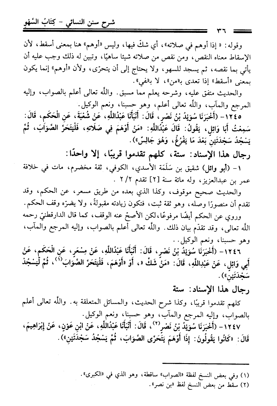 1245 - (أَخْبَرَنَا سُوَيْدُ بْنُ نَصْرٍ، قَالَ: أَنْبَأَنَا عَبْدُ اللَّهِ، عَنْ شُعْبَةَ، عَنِ الْحَكَمِ، قَالَ: سَمِعْتُ أَبَا وَائِلٍ، يَقُولُ: قَالَ عَبْدُ اللَّهِ: "مَنْ أَوْهَمَ فِي صَلاَتِهِ، فَلْيَتَحَرَّ الصَّوَابَ، ثُمَّ يَسْجُدْ سَجْدَتَيْنِ بَعْدَ مَا يَفْرُغُ، وَهُوَ جَالِسٌ").