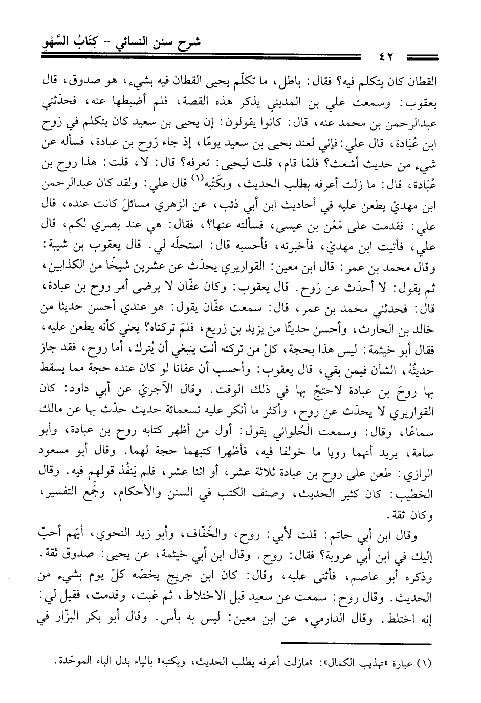 القطان كان يتكلم فيه؟ فقال: باطل، ما تكلّم يحيى القطان فيه بشيء، هو صدوق، قال يعقوب: وسمعت علي بن المديني يذكر هذه القصة، فلم أضبطها عنه، فحدّثني عبد الرحمن بن محمد عنه، قال: كانوا يقولون: إن يحيى بن سعيد كان يتكلم في رَوح ابن عُبَادة، قال علي: فإني لعند يحيى بن سعيد يومًا، إذ جاء رَوح بن عبادة، فسأله عن شيء من حديث أشعث؟ فلمّا قام، قلت ليحيى: تعرفه؟ قال: لا، قلت: هذا روح بن عُبَادة، قال: ما زلت أعرفه بطلب الحديث، وبكَتْبه (¬1) قال علي: ولقد كان عبد الرحمن ابن مهديّ يطعن عليه في أحاديث ابن أبي ذئب، عن الزهري مسائلَ كانت عنده، قال علي: فقدمت على مَعْن بن عيسى، فسألته عنها؟، فقال: هي عند بصري لكم، قال علي، فأتيت ابن مهديّ، فأخبرته، فأحسبه قال: استحلّه لي. قال يعقوب بن شيبة: وقال محمد بن عمر: قال ابن معين: القواريري يحدّث عن عشرين شيخًا من الكذابين، ثم يقول: لا أحدّث عن رَوح. قال يعقوب: وكان عفّان لا يرضى أمر روح بن عبادة، قال: فحدثني محمد بن عمر، قال: سمعت عفان يقول: هو عندي أحسن حديثًا من خالد بن الحارث، وأحسن حديثًا من يزيد بن زريع، فلمَ تركناه؟ يعني كأنه يطعن عليه، فقال أبو خيثمة: ليس هذا بحجة، كل من تركته أنت ينبغي أن يُترك، أما روح، فقد جاز حديثُهُ، الشأن فيمن بقي، قال يعقوب: وأحسب أن عفانا لو كان عنده حجة مما يسقط بها روحَ بن عبادة لاحتجّ بها في ذلك الوقت. وقال الآجريّ عن أبي داود: كان القواريري لا يحدّث عن روح، وأكثر ما أنكر عليه تسعمائة حديث حدّث بها عن مالك سماعًا، وقال: وسمعت الْحُلواني يقول: أول من أظهر كتابه روح بن عبادة، وأبو سامة، يريد أنهما رويا ما خولفا فيه، فأظهرا كتبهما حجة لهما. وقال أبو مسعود الرازي: طعن على روح بن عبادة ثلاثة عشر، أو اثنا عشر، فلم يَنفُذ قولهم فيه. وقال الخطيب: كان كثير الحديث، وصنف الكتب في السنن والأحكام، وجَمَع التفسير، وكان ثقة.